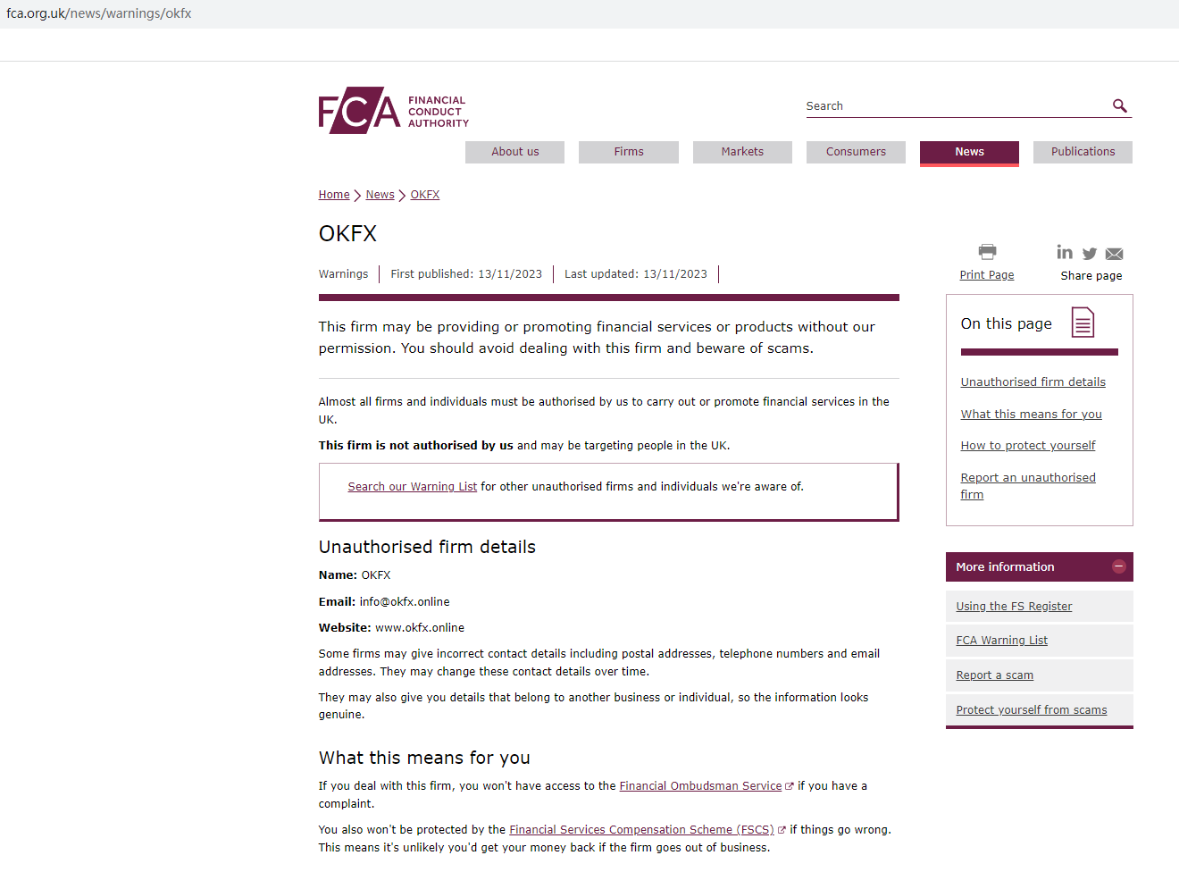 OKFX claims to be a reliable company and regulated in the UK. However upon investigation, we found that the United Kingdom Financial Conduct Authority (UK FCA) issued a warning that OKFX was providing finacial services or products without authorisation.