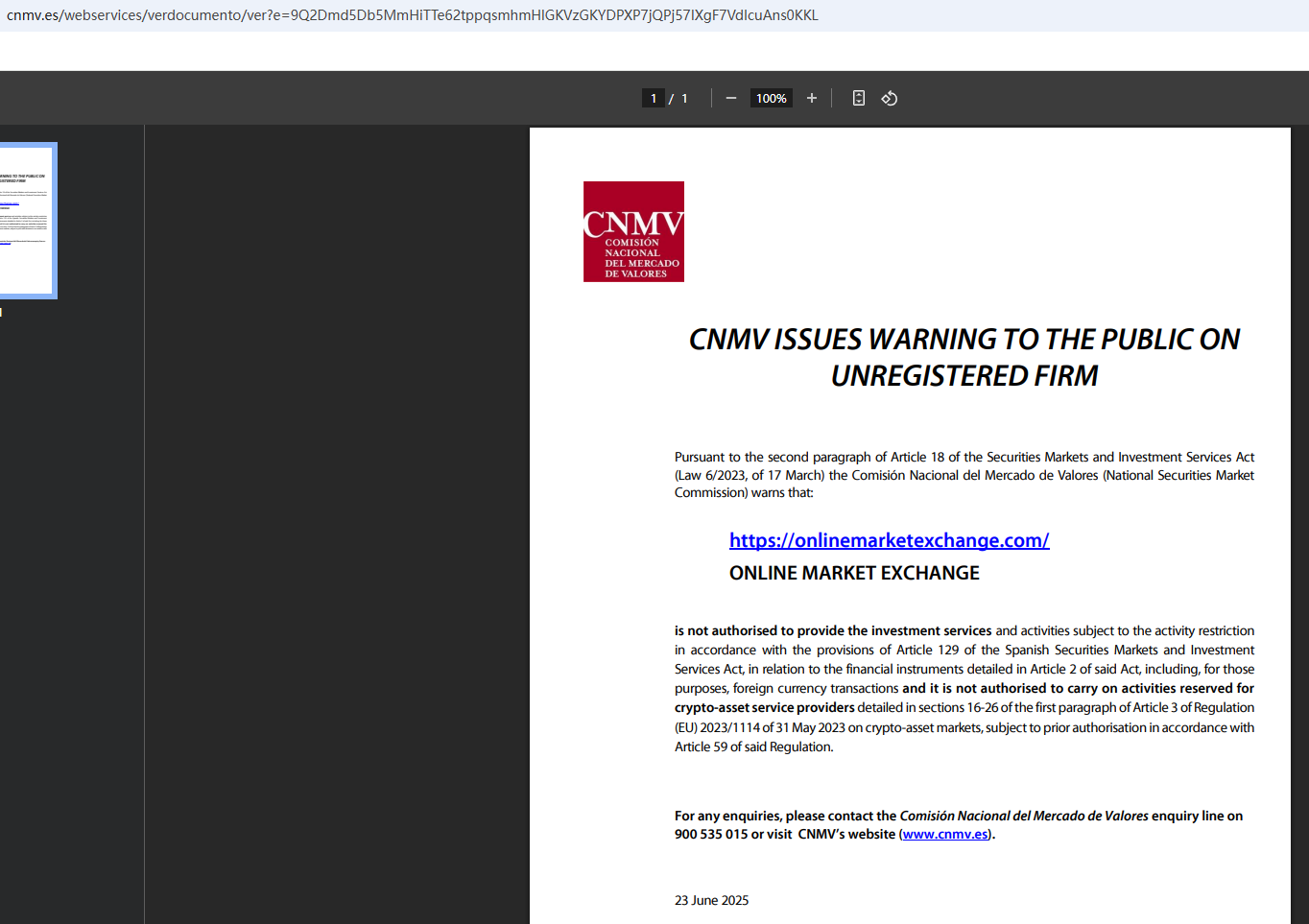 On June 23, 2025, the National Securities Market Commission (CNMV) issued a warning against ONLINE MARKET EXCHANGE , believing this company might be providing financial services or products without proper authorization. https://www.cnmv.es/webservices/verdocumento/ver?e=9Q2Dmd5Db5MmHiTTe62tppqsmhmHlGKVzGKYDPXP7jQPj57IXgF7VdIcuAns0KKL