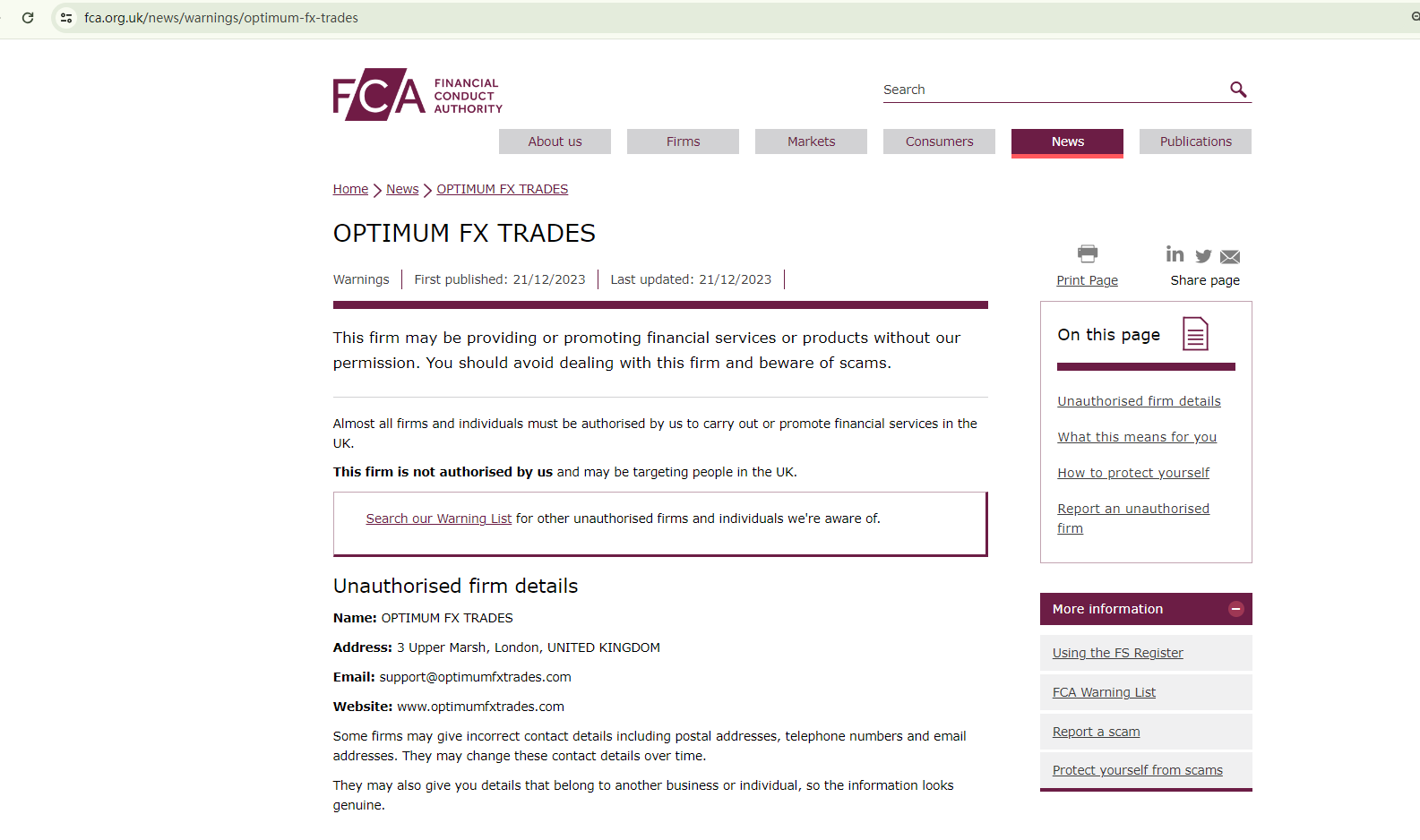 Furthermore, the Financial Conduct Authority (FCA) has flagged Optimum Fx Trades as an unauthorized firm in the UK that illegally provides financial services within this country.
