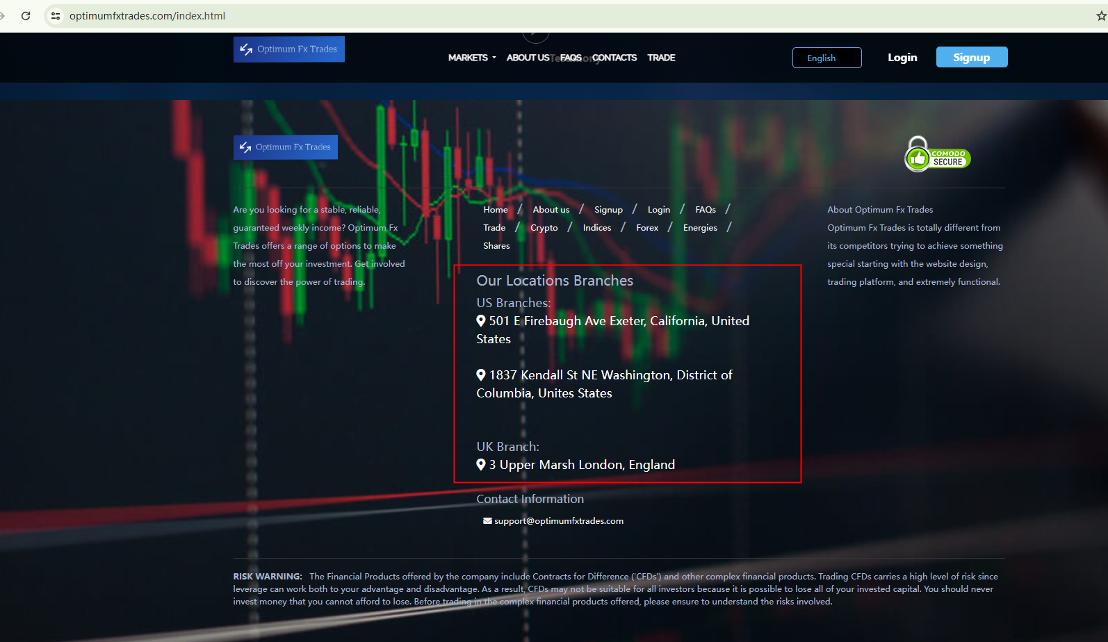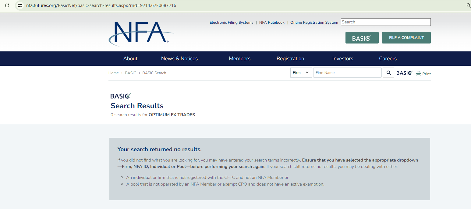 While Optimum Fx Trades keeps creating the illusion of legitimacy and reliability, the content its website presents suggests otherwise.It fails to provide regulatory information, which can be considered a significant indicator for potential scams. Despite the claims of having offices in the US and the UK, it is not registered as a member of the National Futures Association (NFA) in accordance to the US regulations.Furthermore, the Financial Conduct Authority (FCA) has flagged Optimum Fx Trades as an unauthorized firm in the UK that illegally provides financial services within this country.In essence, Optimum Fx Trades is not regulated by any governing body. Entrusting this broker with investors' funds is highly risky, as there are no legal protections in place to safeguard the funds.Optimum Fx Trades appears to be a scam.