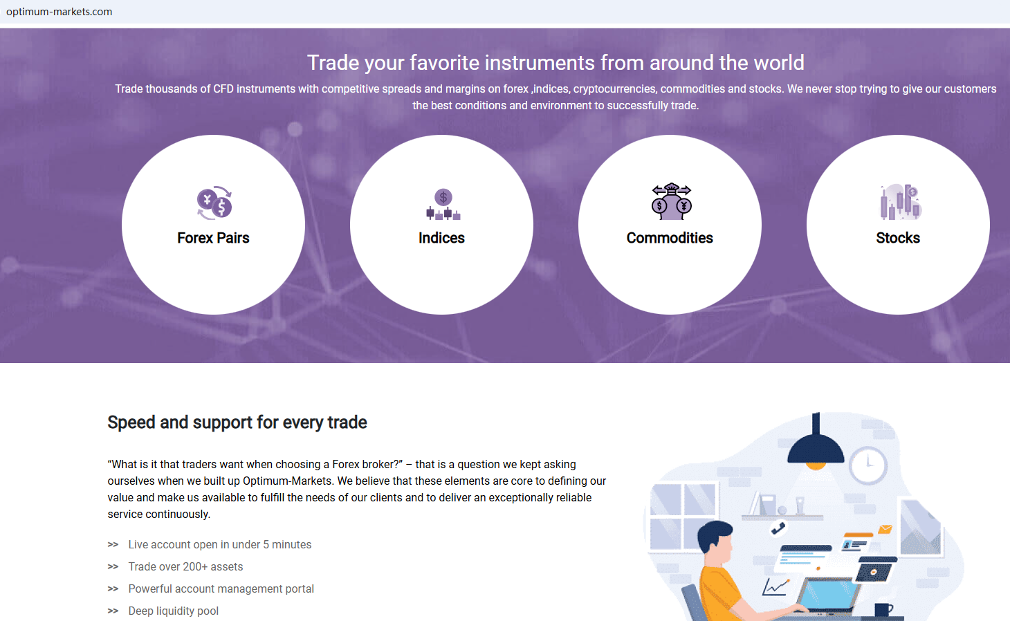 Optimum Markets claims to be a investment platform, offering a range of investment products to traders, including forex, indices, cryptocurrencies, commodities, stocks and more instruments for trading in global markets. But it does not give information about his country of origin. A company that offers financial services must give an address and have a financial license in the country where it is located.