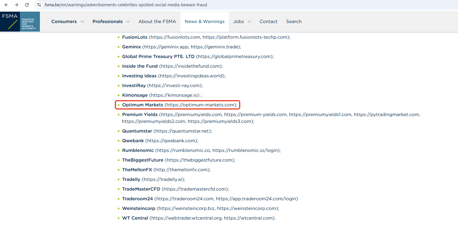 The Financial Services and Markets Authority (FSMA) issued a warning against Optimum Markets, believing this company might be providing financial services or products without authorisation in Belgium.