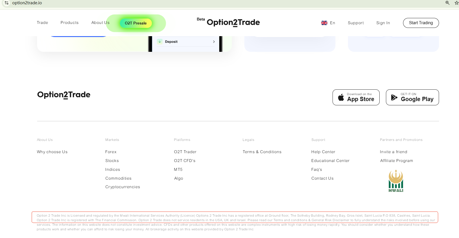 Option 2 Trade claims to be registered with the Mwali International Services Authority (MISA), the Financial Commission. It also purports to be registered in St. Lucia. However, our search for the company in the registers of MISA and Financial Commission hasn't found corresponding records. As for the alleged registration in St. Lucia, it doesn't constitute a license from a financial regulator. What's more, the country has announced that forex trading activities are not licensed there.