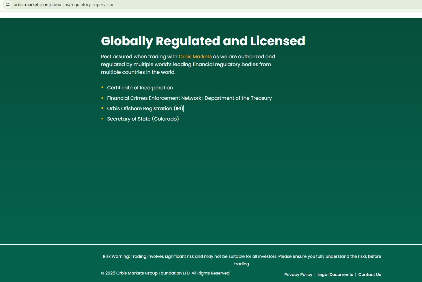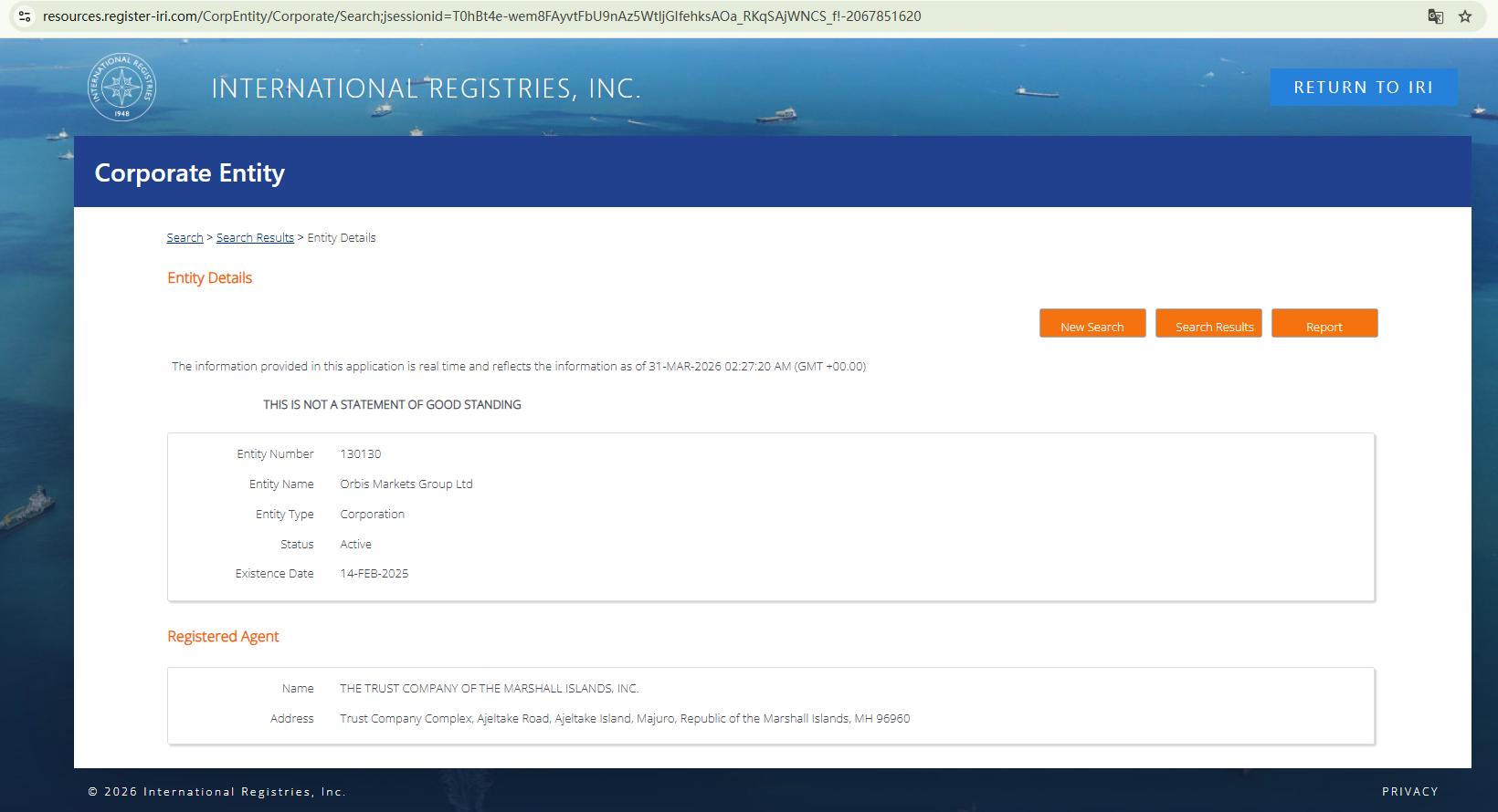 Orbis Markets does not claim to be licensed by any regulator; it only claims to be registered in Marshall Islands. While we can confirm that there is a company with the same name in the Marshall Islands Registry (IRI), this registration only grants it International Business Company (IBC) status. This does not constitute a valid financial licence. The Marshall IRI is not a government agency, nor a regulator, and does not regulate forex trading activities.