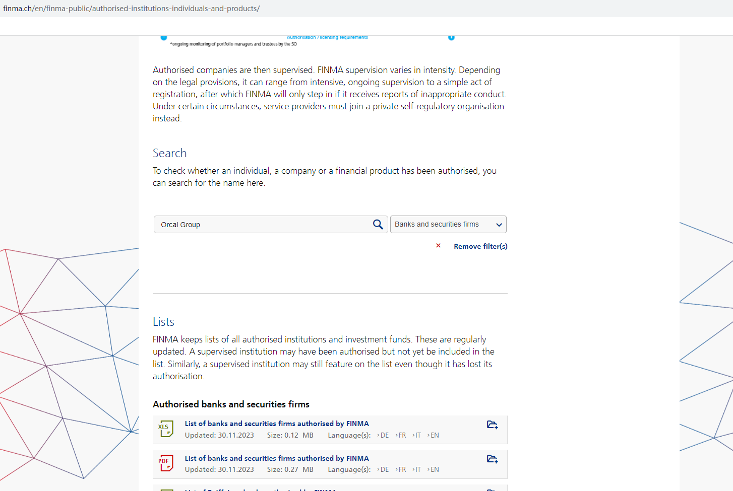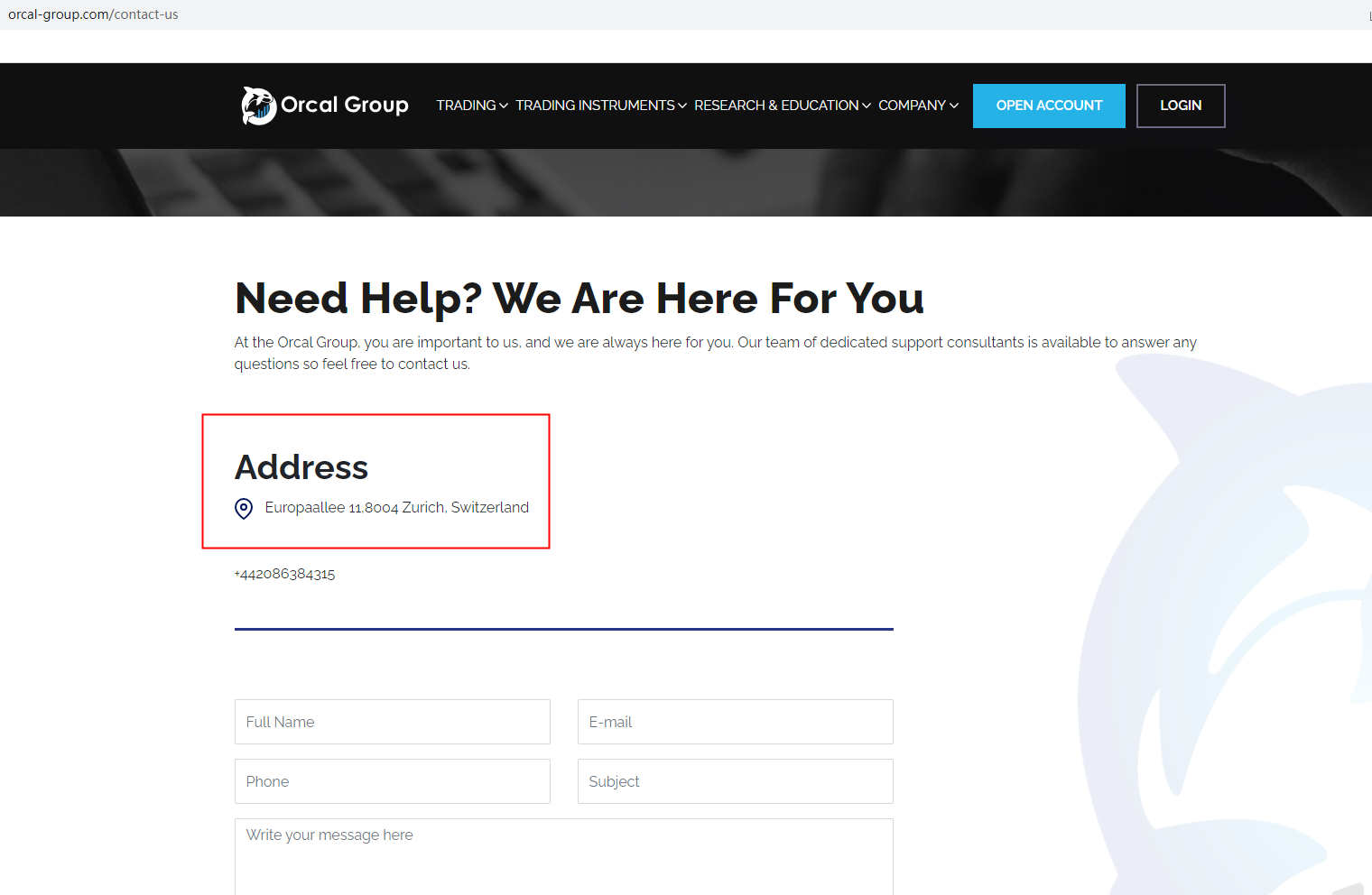 According to its website, it is located in the Switzerland, however, upon investigation, no matching information was found in the Swiss Financial Market Supervisory Authority (FINMA).In addition, the United Kingdom Financial Conduct Authority (UK FCA) issued a warning that Orcal Group was providing financial services or products in the UK without authorisation.The truth is that Orcal Group is not regulated by any regulators. Letting it hold or control investors' money is unsafe and the money can not be protected by any laws.Therefore, Orcal Group is a scam.