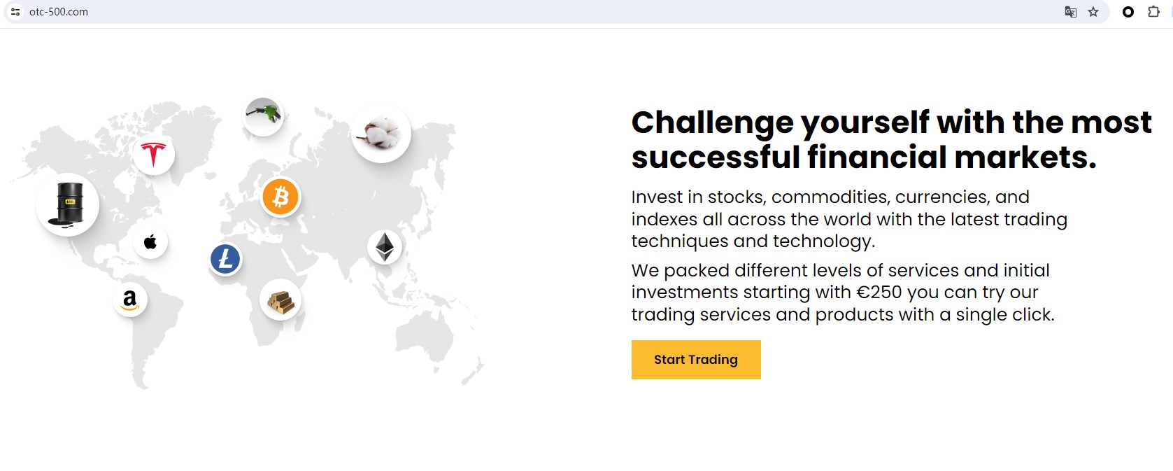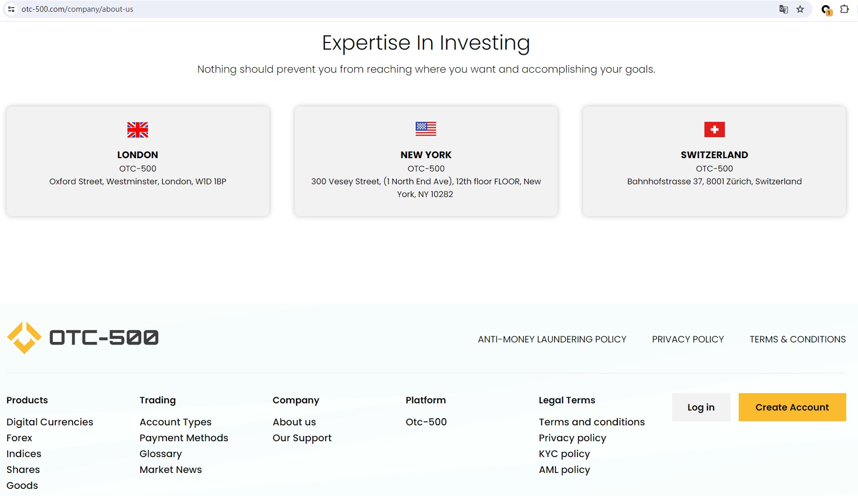 OTC-500 claims to be a online trading broker, which has offices in the United Kingdom, the United States, and Switzerland, offering wide range of financial services, including Digital Currencies, Forex, Indices, Shares, Goods and more instruments in global markets. But it lacks crucial regulatory information, a company that offers financial services must give an address and have a license in the country where it is located.