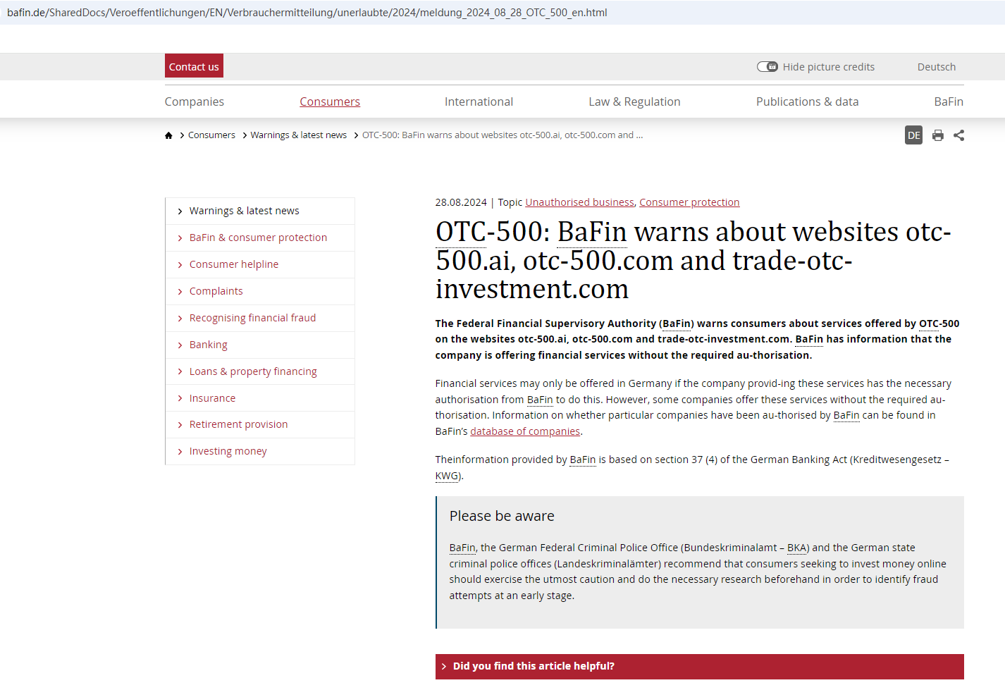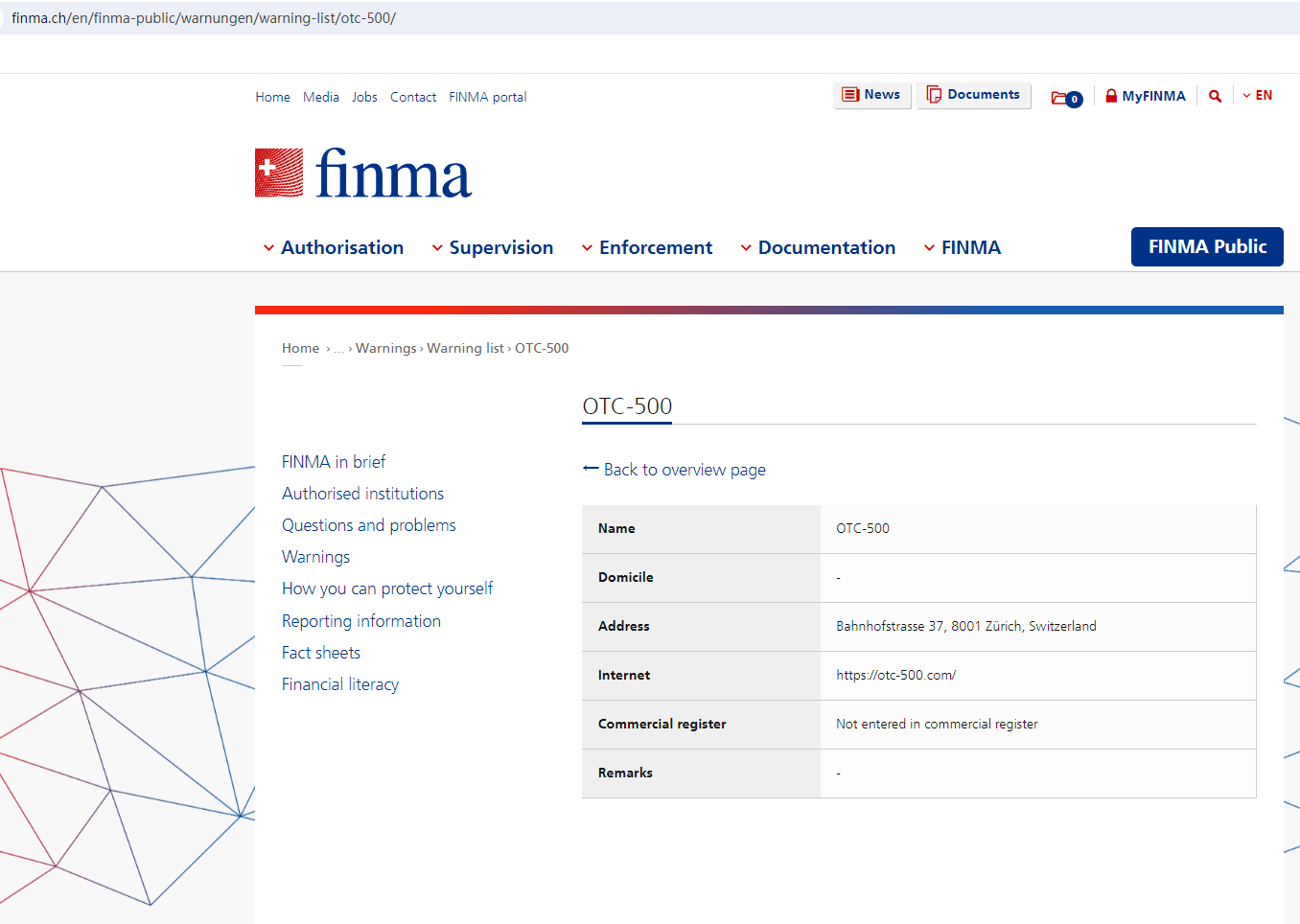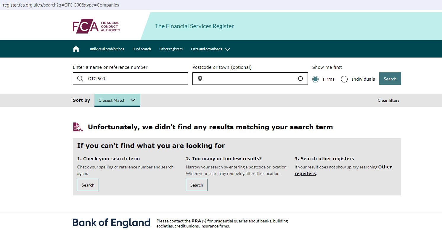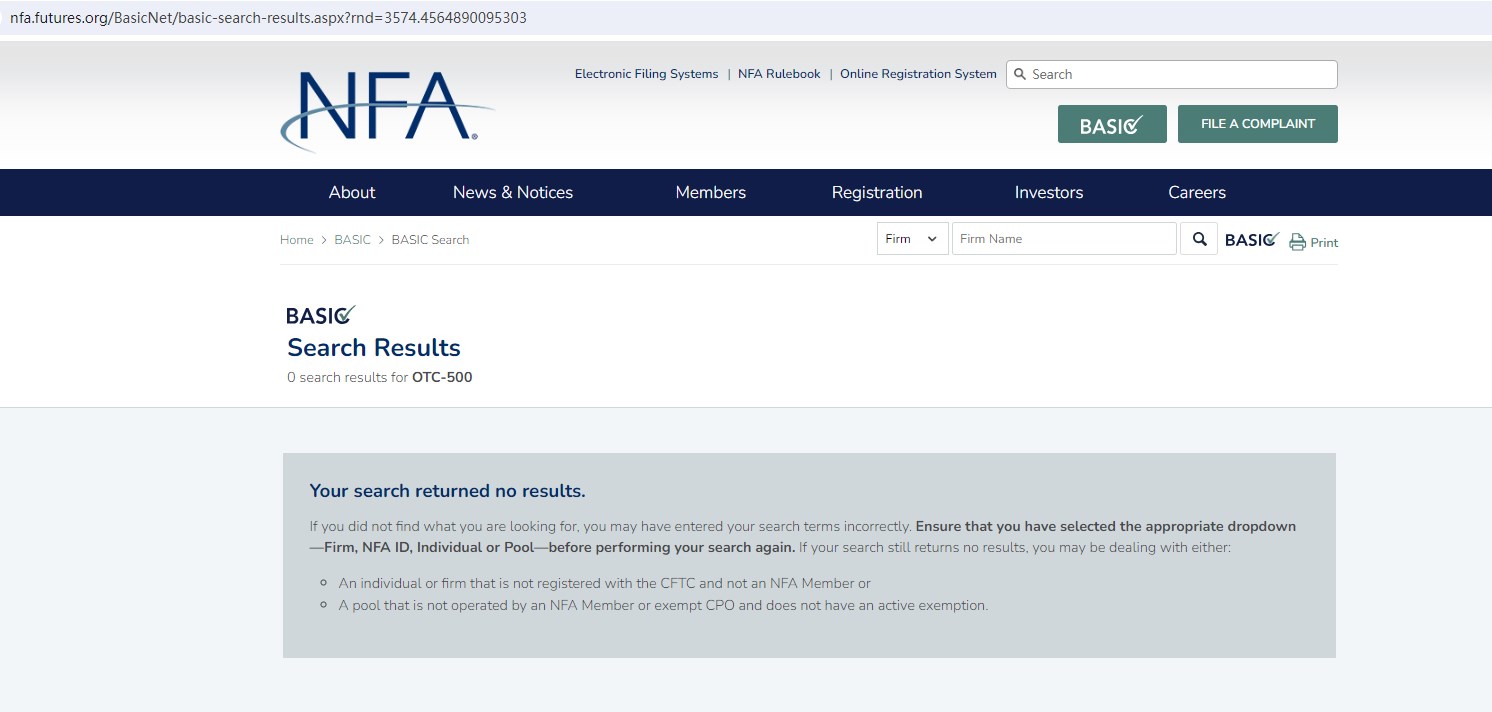Upon investigation, we found that OTC-500 is not regulated by the United Kingdom Financial Conduct Authority (FCA), the National Futures Association (NFA) in the US and the Swiss Financial Market Supervisory Authority (FINMA).