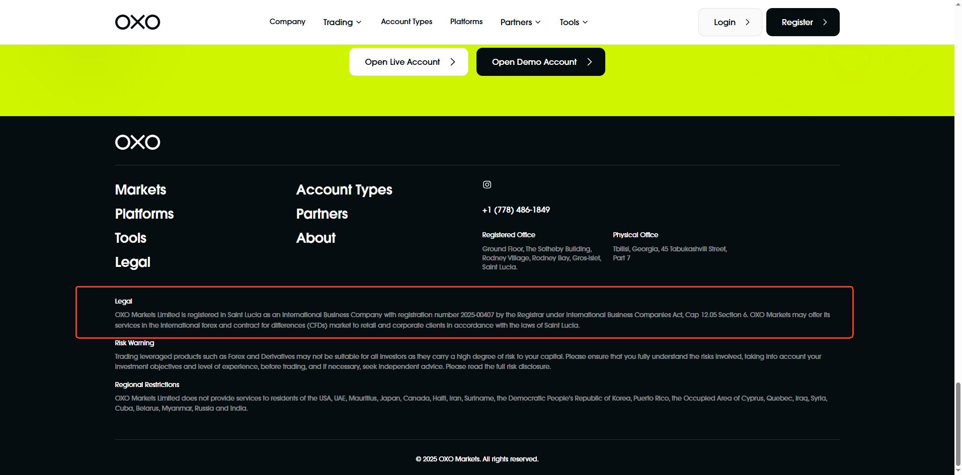It states it operates under OXO Markets Limited, which is registered with the Saint Lucia International Financial Centre (IFC). While this entity does appear in the IFC registry, it holds only International Business Company (IBC) status. Importantly, the Saint Lucia IFC does not regulate or license forex brokers, nor does it provide investor protection mechanisms.