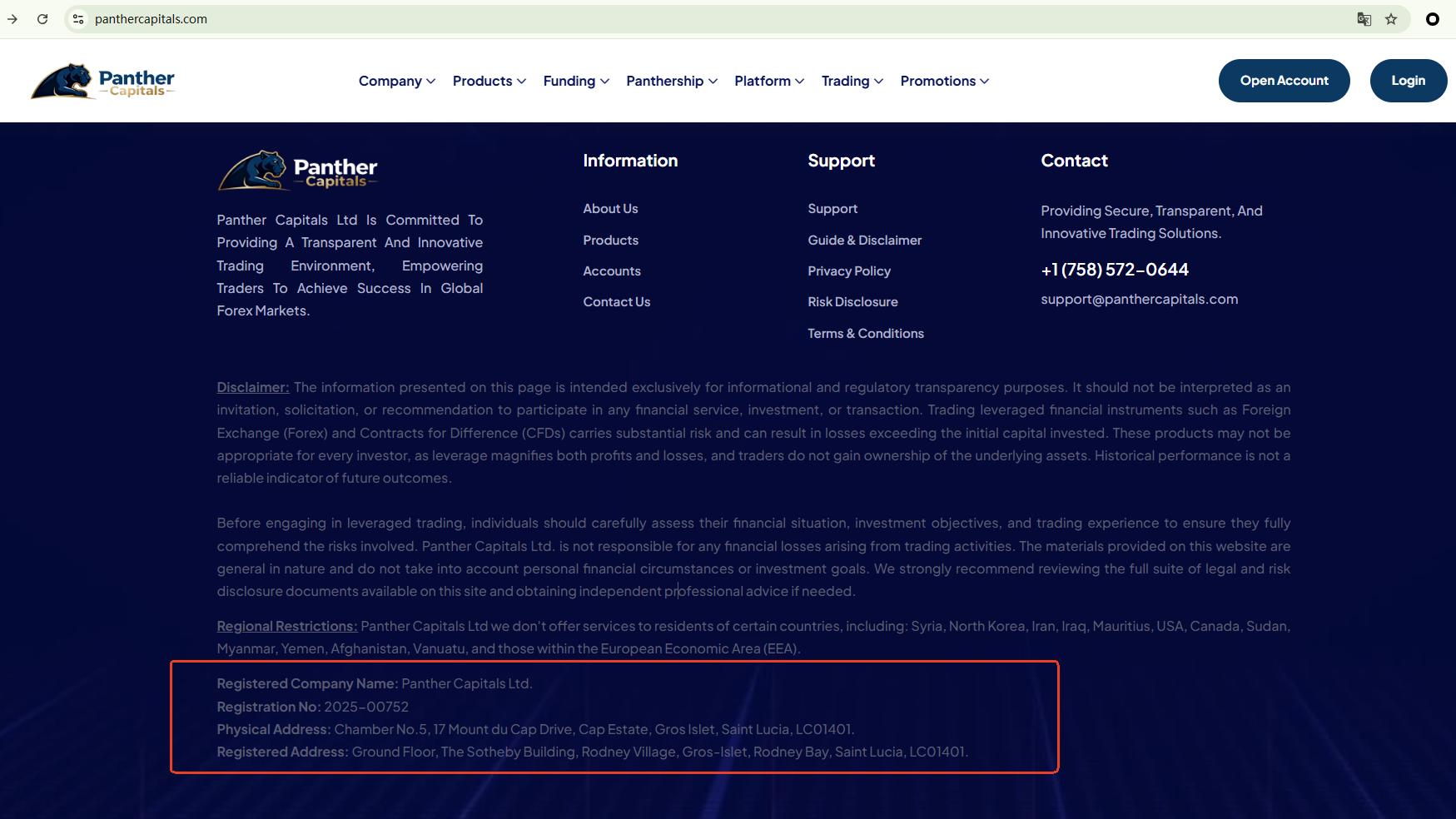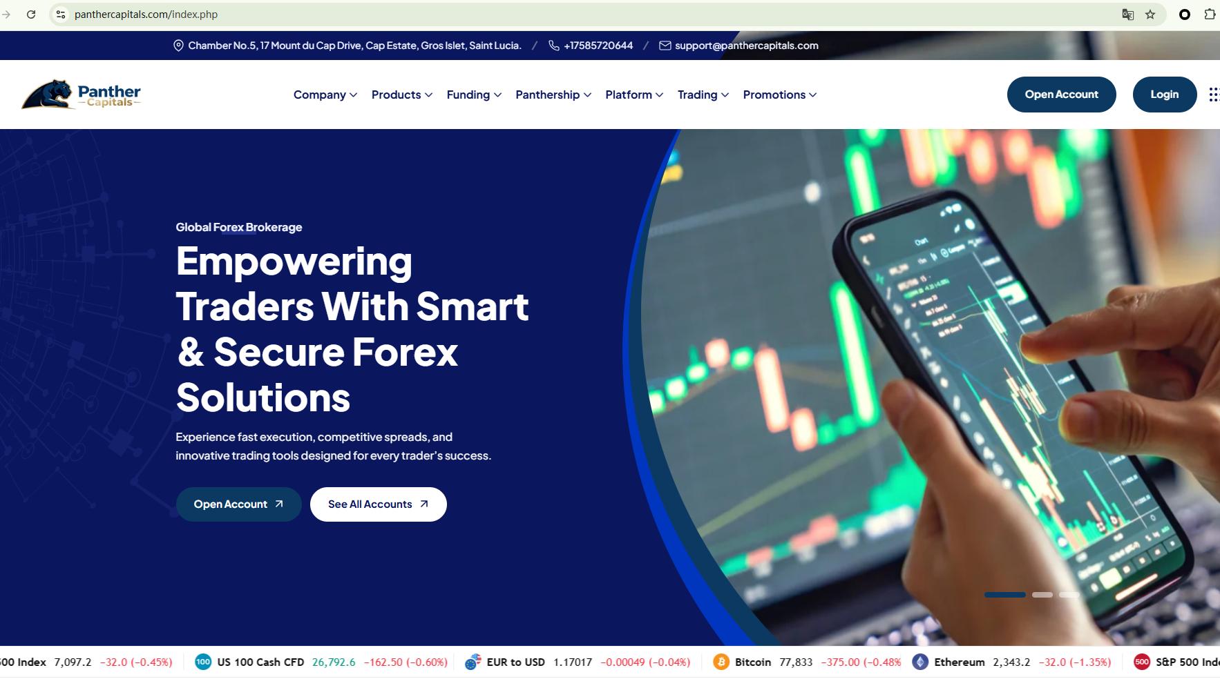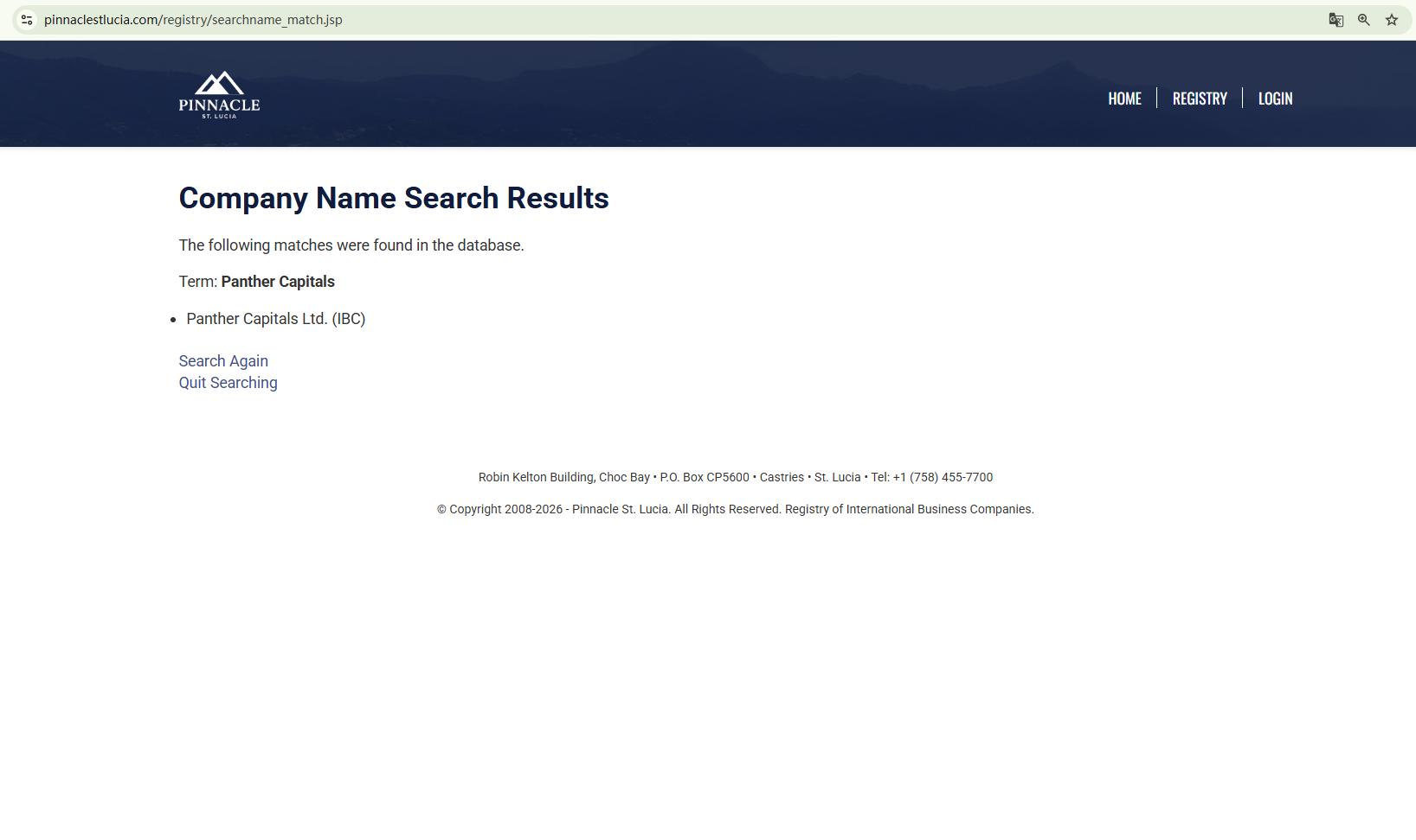 Panther Capitals does not claim to be licensed by any regulator; it only claims to be registered in Saint Lucia. While we can confirm that there is a company with the same name in the Saint Lucia International Financial Centre (IFC) registry, this registration only grants it International Business Company (IBC) status. This does not constitute a valid financial licence. The IFC neither regulates nor licences forex trading activities.