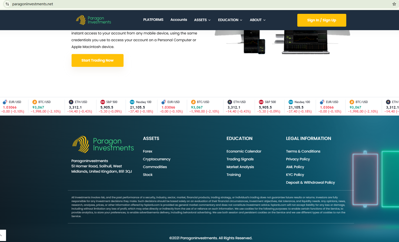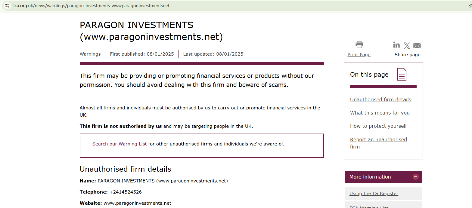 While PARAGON INVESTMENTS claims to be a trading platform providing financial services for trading forex and CFDs, the broker doesn't provide any documentation to prove its legitimacy and compliance. In addition, this company purports to be domiciled in the UK, but has been flagged by the Financial Conduct Authority (FCA) as unauthorized in the country.
