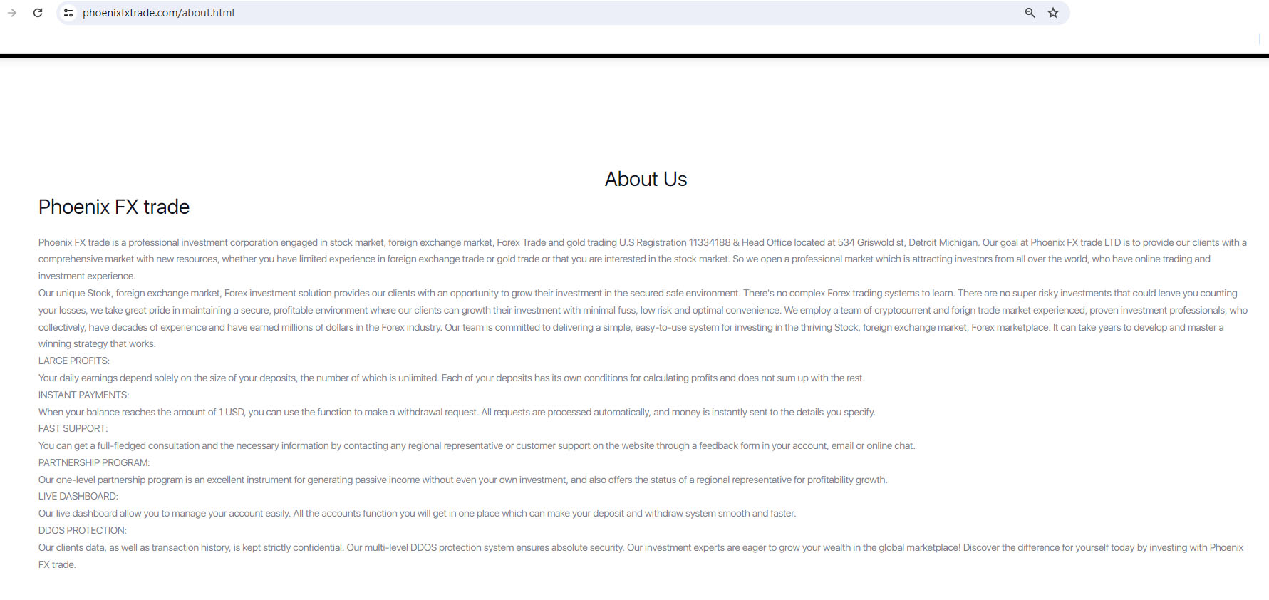 According to its website, Phoenix FX trade claims are registered in the United States with registration number 11334188, but our investigation revealed that it is not licensed in the US, as no matching information was found in the National Futures Association (NFA).