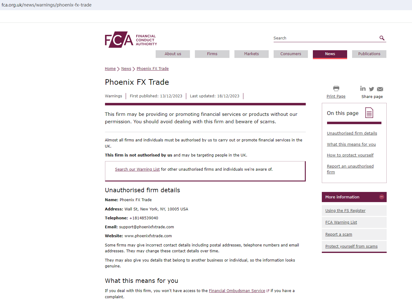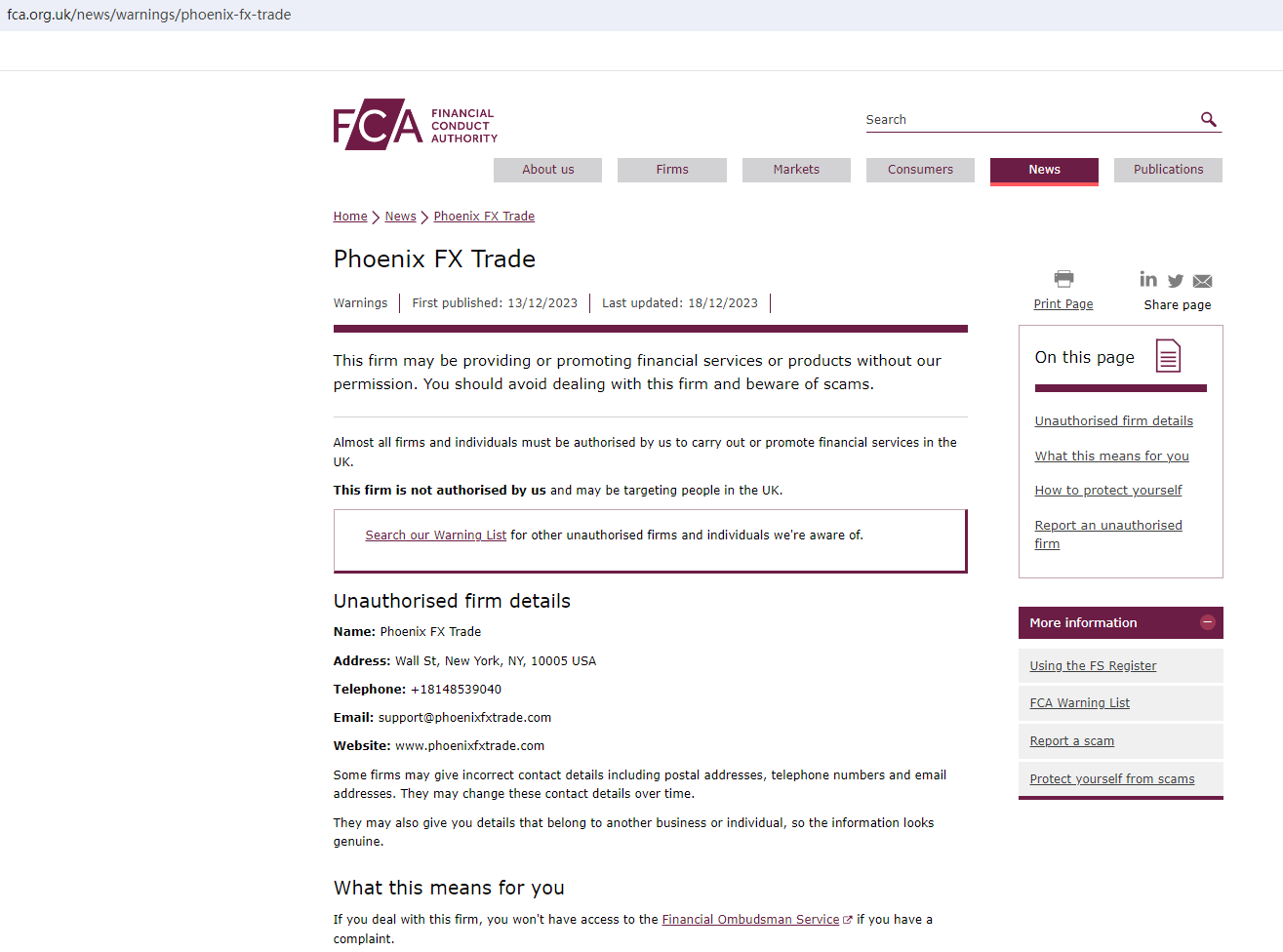 In addition, the United Kingdom Financial Conduct Authority (UK FCA) issued a warning that Phoenix FX Trade was providing financial services or products in the UK without authorisation.