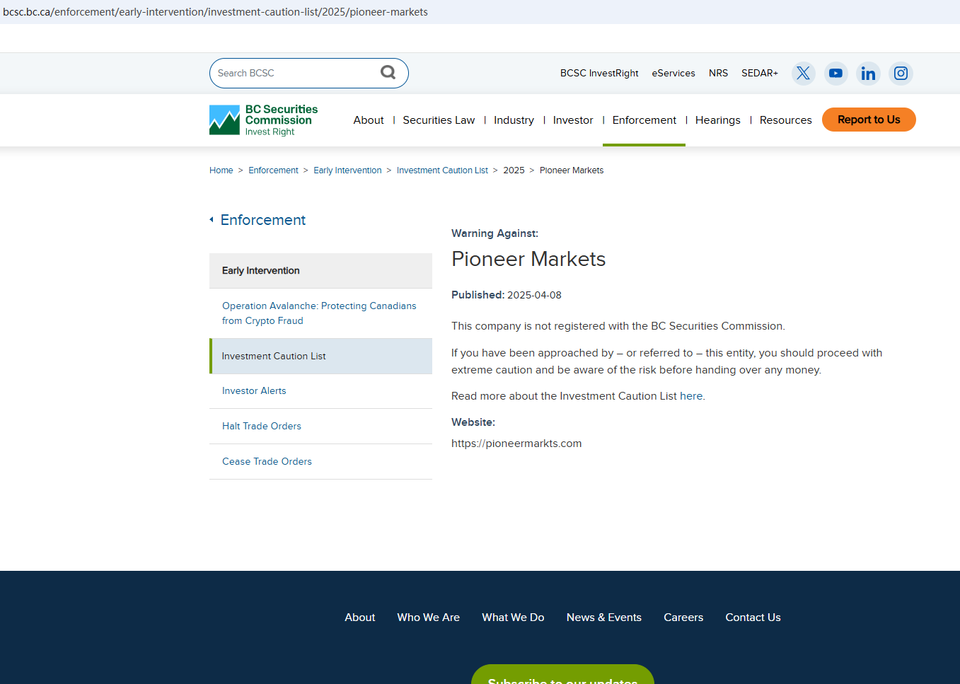 It claims on its website that it is affiliated with TCW Group and is registered in St. Lucia. As we all know, St. Lucia does not have the right to regulate foreign exchange. More importantly, the British Columbia Securities Commission (BCSC) issued a warning that Pioneer Markets was providing financial services or products without authorisation.