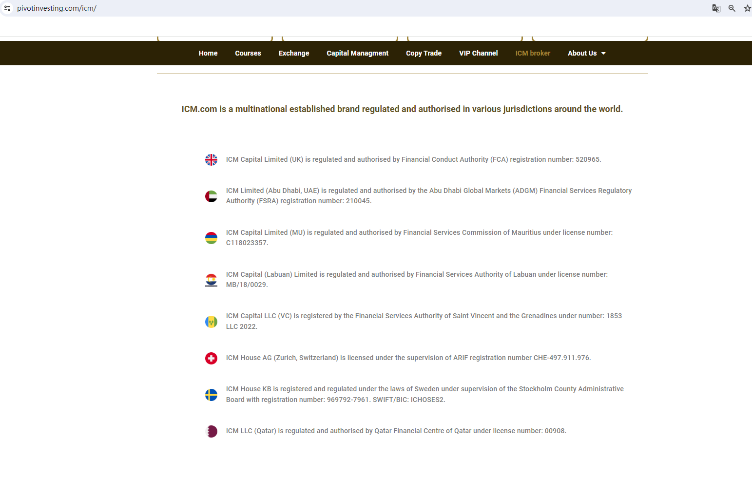 According to its website, it claims to be a multinational brand that is regulated and authorized in multiple jurisdictions around the world, and displays all regulatory information on its own website. However, our verifications suggest that the trade name and registered website address associated with this license numbers are inconsistent with Pitvot Investing and its domain name. This is obviously theft of regulatory information from compliant companies. In addition, there is no evidence that ICM.com, the genuine holder of this licenses has any connection with Pivot Investing.
