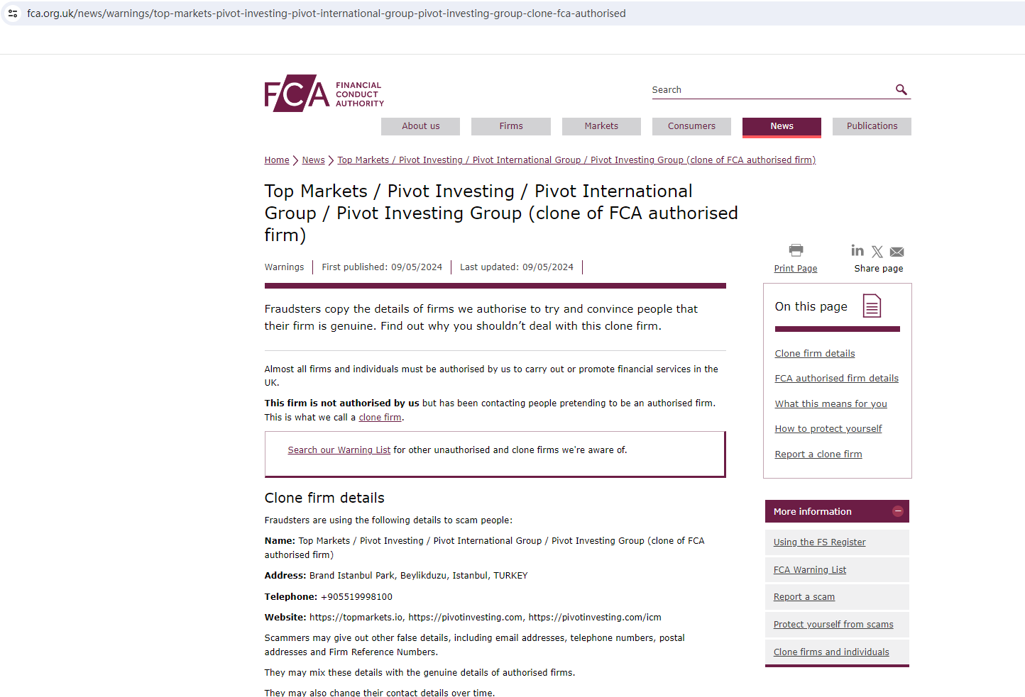 On May 9, 2024, the Financial Conduct Authority (FCA) issued a warning against Pivot Investing, identifying this company as a clone of an FCA-authorized firm. https://www.fca.org.uk/news/warnings/top-markets-pivot-investing-pivot-international-group-pivot-investing-group-clone-fca-authorised