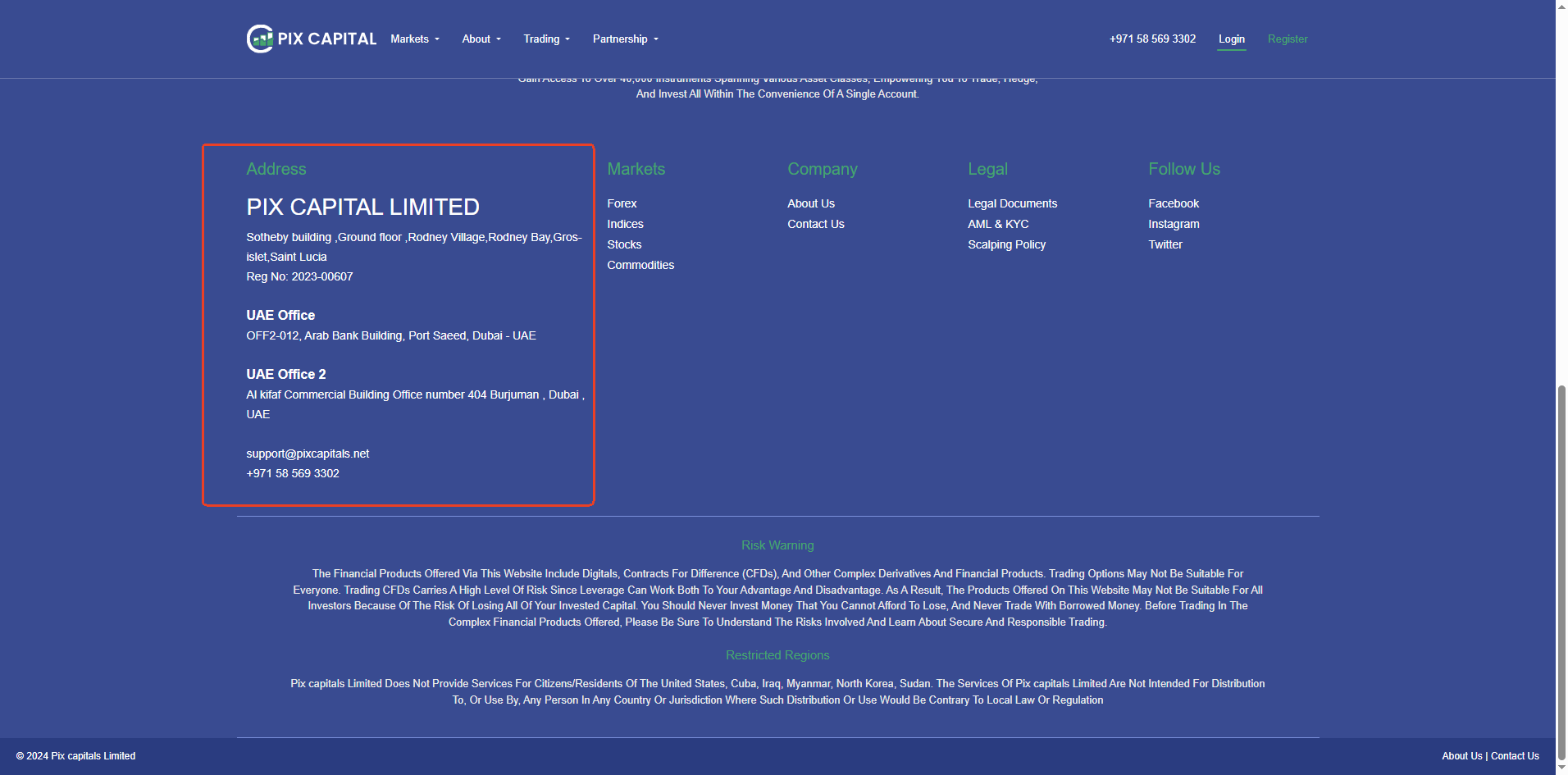 Pix Capital claims to be registered in Saint Lucia and to maintain an office address in Dubai.