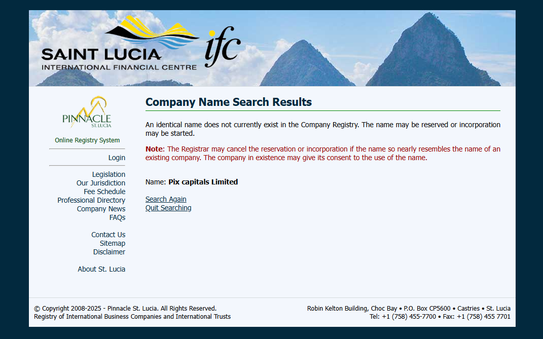 First, a search of the Saint Lucia International Financial Centre (IFC) registry shows that the entity Pix Capitals Limited, as referenced by the platform, does not appear as a fully registered company. It may still be in the process of registration, meaning it currently lacks even basic corporate standing. Moreover, even if registration were completed, it would only confer International Business Company (IBC) status, which does not constitute a valid financial services or forex trading license.