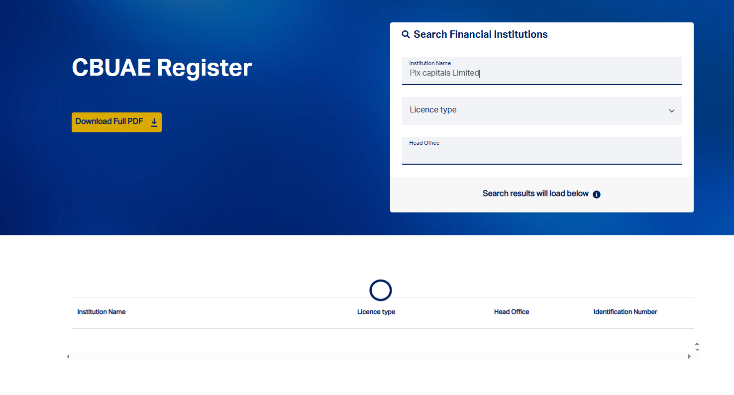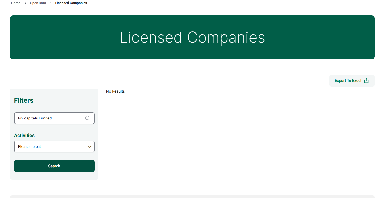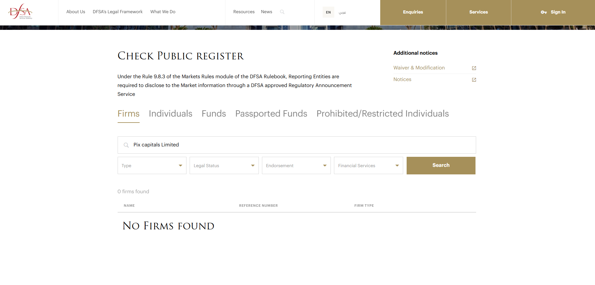 Second, despite listing a Dubai presence, Pix Capitals Limited holds no license from any of the relevant UAE regulatory authorities, including the Dubai Financial Services Authority (DFSA), the Securities and Commodities Authority (SCA), or the Central Bank of the UAE (CBUAE). This means its operations in the UAE are not authorized and fall entirely outside regulatory oversight.