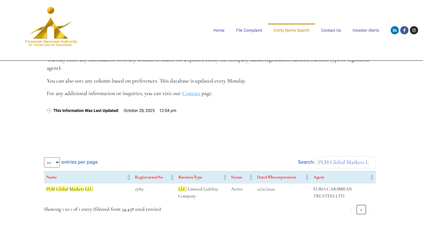 The only verifiable detail is its registration in Saint Vincent and the Grenadines. We have confirmed that PLM Global Markets LLC is listed in the registry of the Financial Services Authority (FSA) of Saint Vincent and the Grenadines. However, this registration only grants the company International Business Company (IBC) status, which does not constitute a genuine financial license. The SVG FSA has publicly stated that it does not regulate or license forex trading.