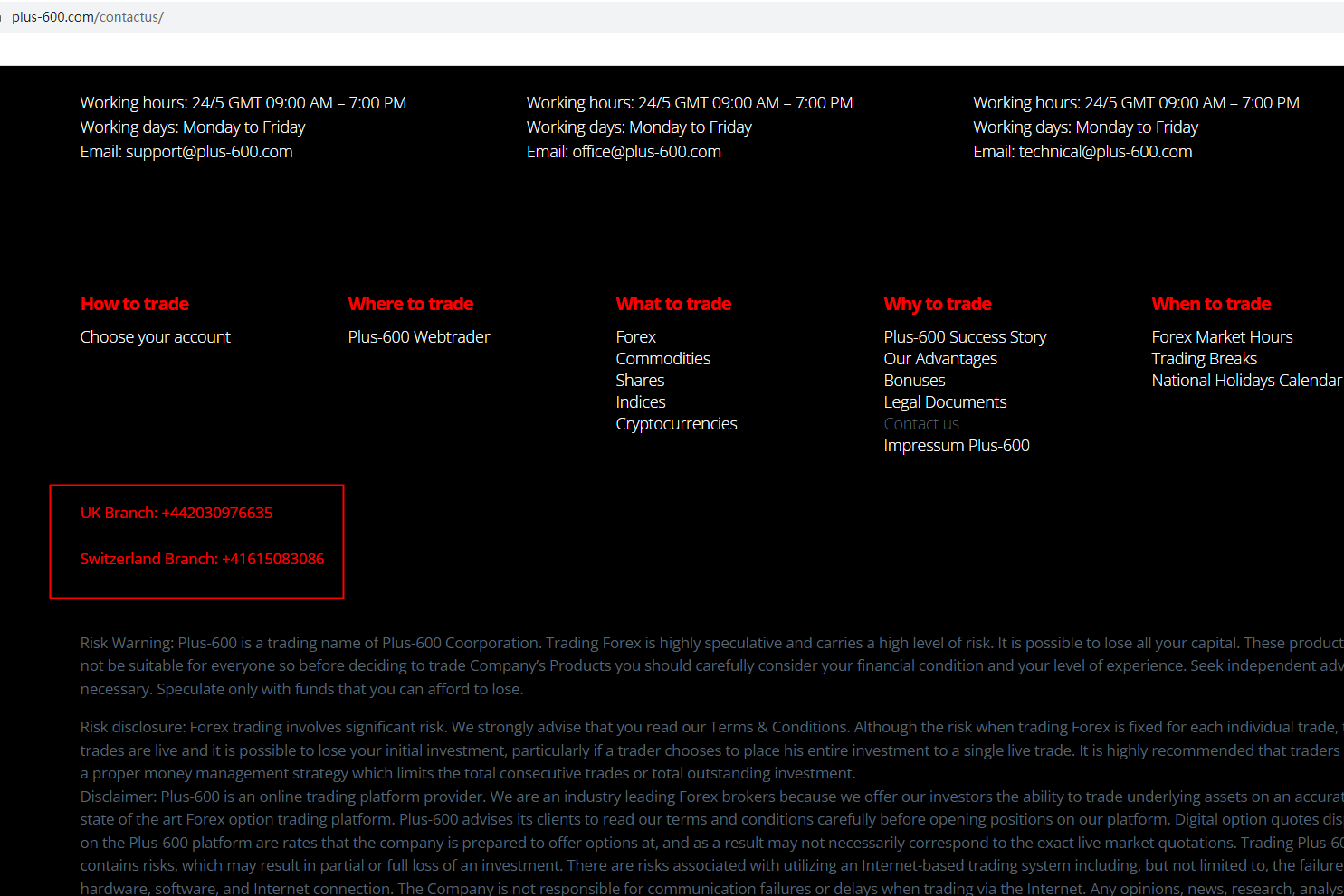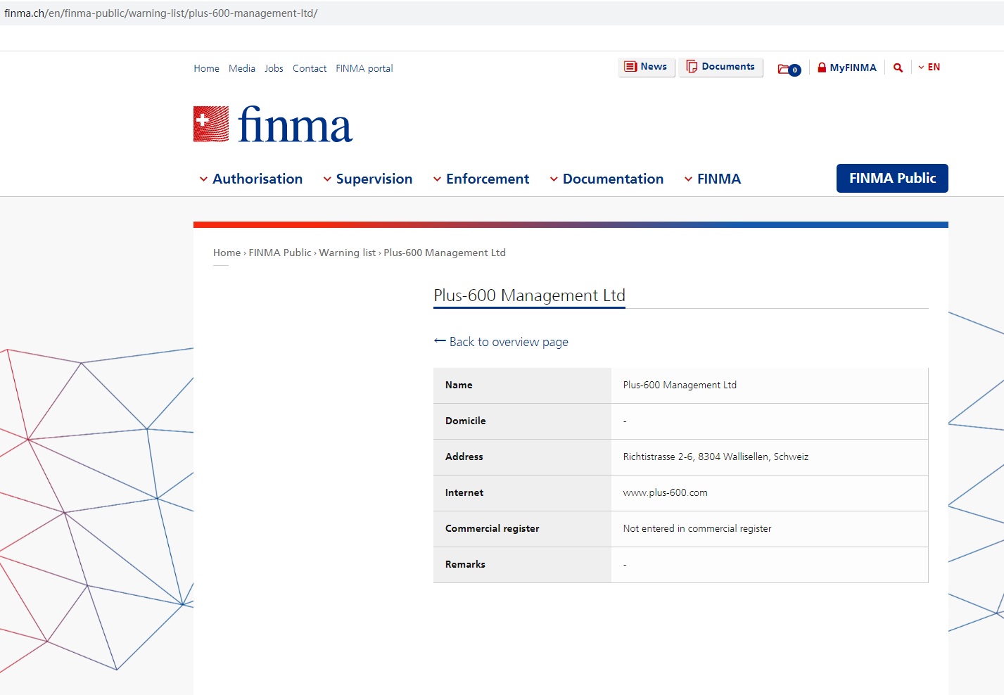 According to its website, it has two office addresses, one is located in the UK and the other is located in Switzerland, but upon investigation, no matching information was found in the Financial Conduct Authority (FCA), and in addition, the Swiss Financial Market Supervisory Authority (FINMA) issued a warning that Plus 600 Management Ltd was providing financial services or products without authorisation.