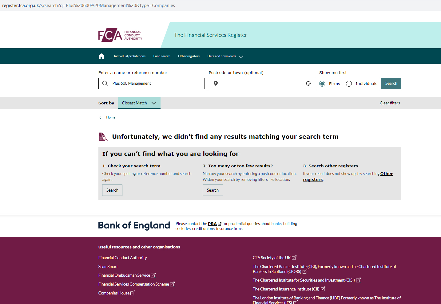 According to its website, it has two office addresses, one is located in the UK and the other is located in Switzerland, but upon investigation, no matching information was found in the Financial Conduct Authority (FCA), and in addition, the Swiss Financial Market Supervisory Authority (FINMA) issued a warning that Plus 600 Management Ltd was providing financial services or products without authorisation.The truth is that Plus 600 Management Ltd is not regulated by any regulators. Letting it hold or control investors' money is unsafe, and the money can not be protected by any laws.Plus 600 Management Ltd is a scam.