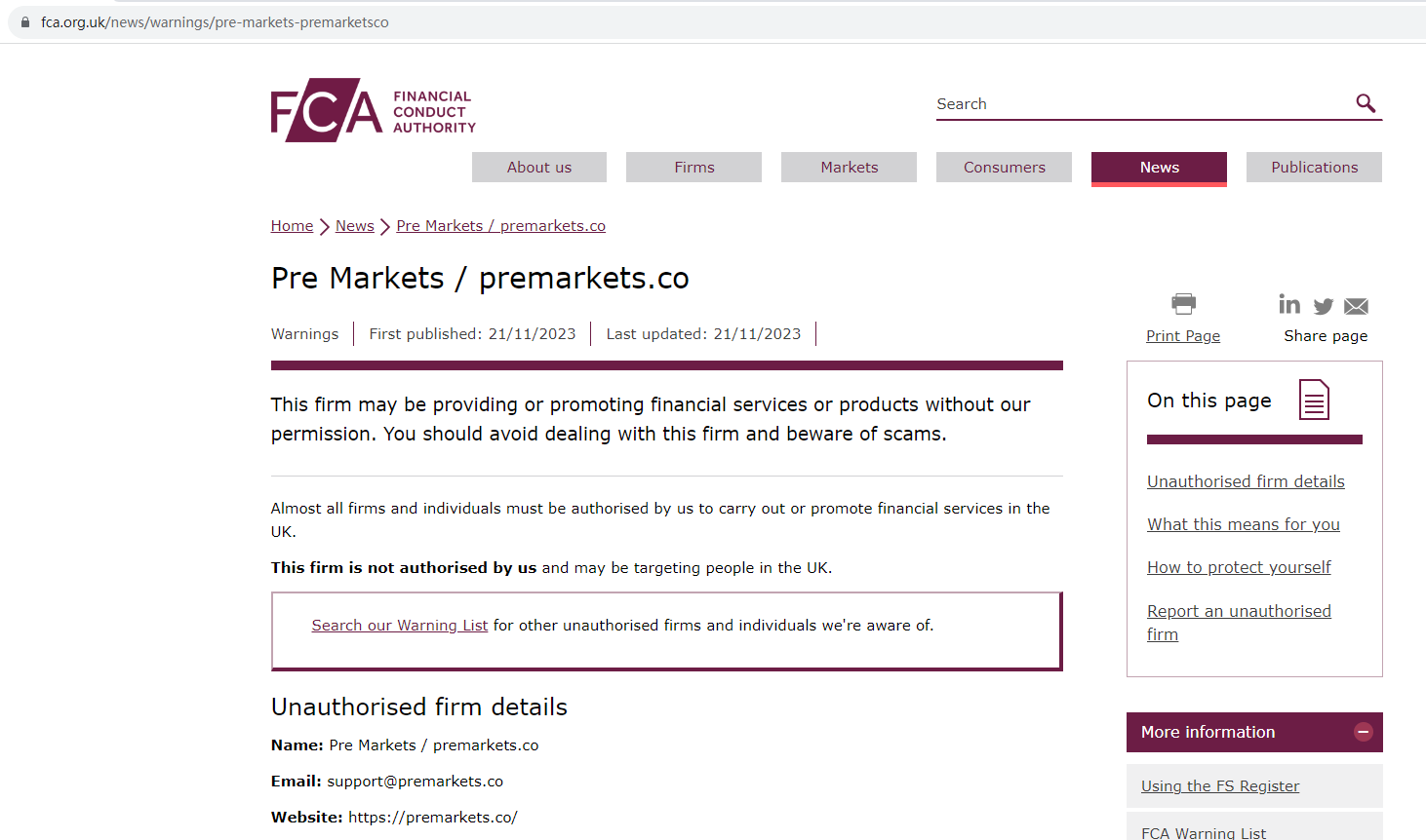 The United Kingdom Financial Conduct Authority (UK FCA) issued a warning that Pre Markets was providing finacial services or products without authorisation.