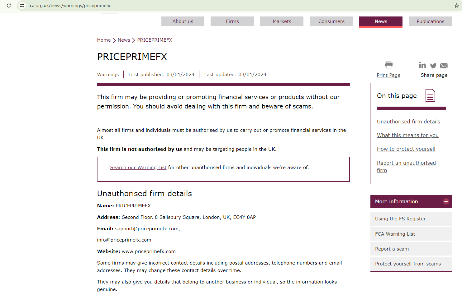 Price Prime Fx claims to be regulated, but it doesn't provide any specific information regarding its regulatory status. The absence of regulatory oversight is a red flag.While it claims to be located in the UK, this company has been red-flagged by the Financial Conduct Authority (FCA) as an unauthorized entity in this country. This non-compliance suggests a potential fraud scheme.In essence, Price Prime Fx is not regulated by any governing body. Entrusting this broker with investors' funds is highly risky, as there are no legal protections in place to safeguard the funds.Price Prime Fx appears to be a scam.