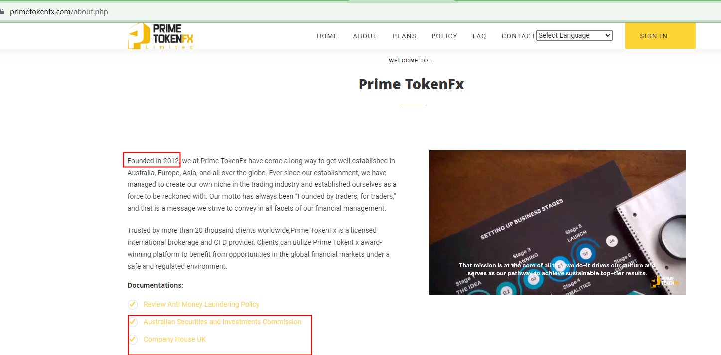 PRIME TOKENFX provides two links, one named Australian Securities and Investments Commission (ASIC) and the other Companies House UK, to appear legitimate. However, the former link directs us to its meaningless Swiss Business license and the latter to a page showing 404 Not Found.