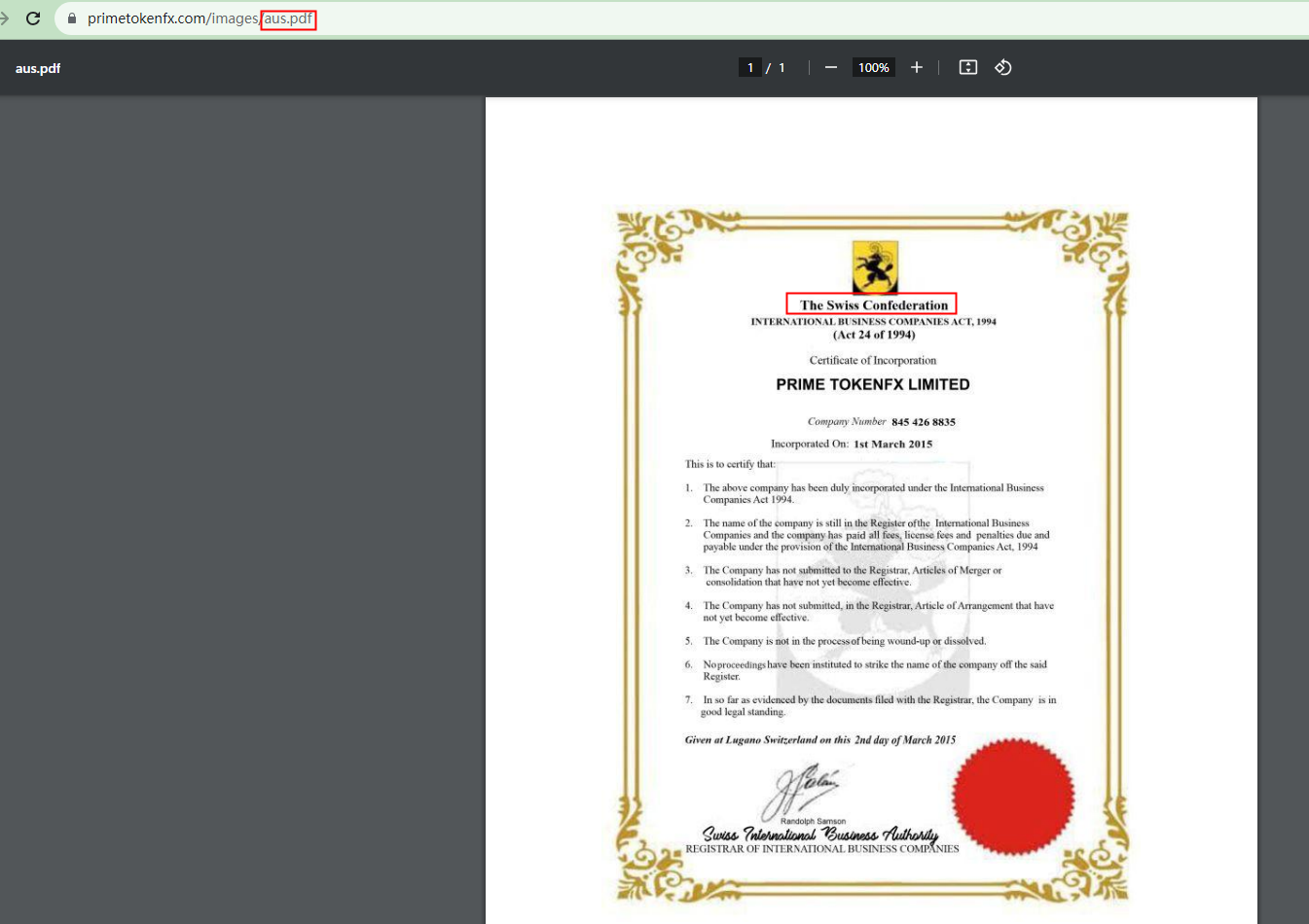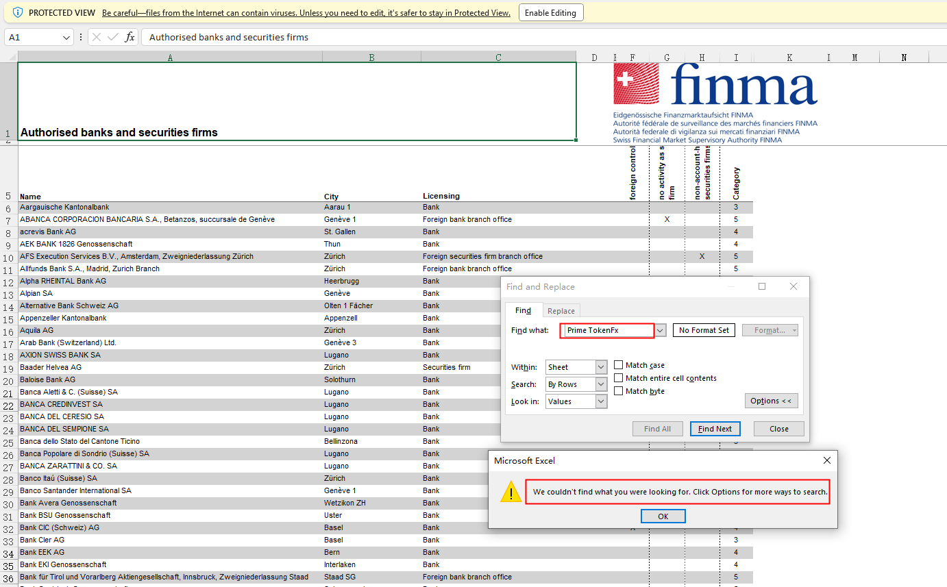 PRIME TOKENFX displays a business license, claiming that it is registered in Switzerland. However, our search for this company in the register of the Swiss Financial Market Supervisory Authority (FINMA) didn't yield any results. This means it is not authorized by FINMA to operate in this country, making the business license meaningless.