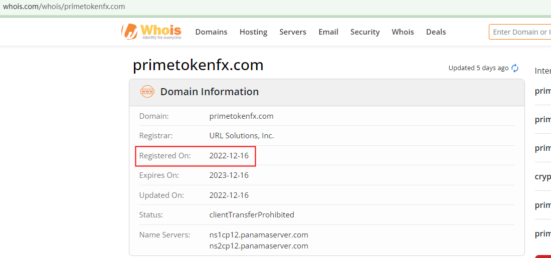 PRIME TOKENFX claims to be an established trading platform since 2015 (On its About page, it changes the timing into 2012). However, its domain name "primetokenfx.com" was first registered at the end of 2022. This gulf between the website's age and its claim about its history badly hurts its credibility.