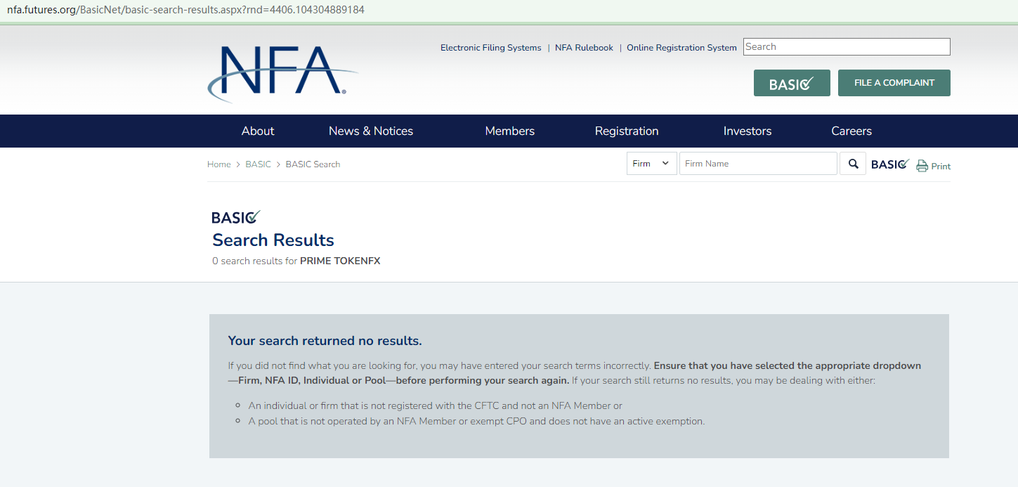 PRIME TOKENFX even claims to be exempt from the US regulation. However, forex brokers must be a member of the National Futures Association (NFA) before they can accept US customers. The fact is PRIME TOKENFX is not an NFA-member.