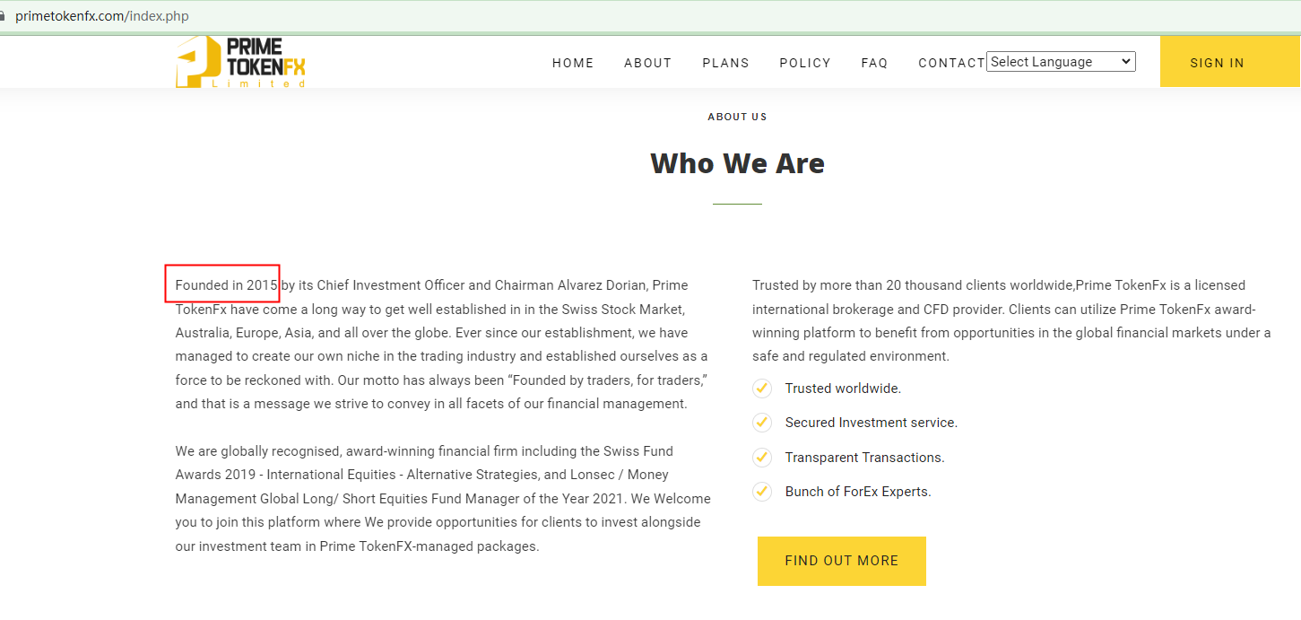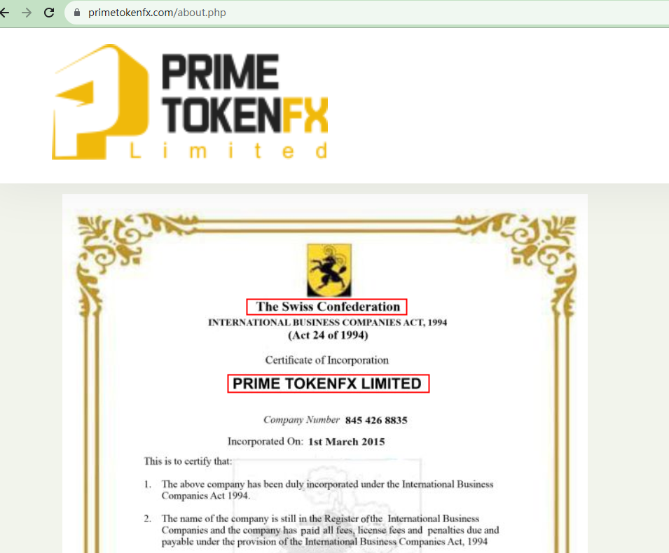 PRIME TOKENFX claims to be an established trading platform since 2015 (On its About page, it changes the timing into 2012). However, its domain name "primetokenfx.com" was first registered at the end of 2022. This gulf between the website's age and its claim about its history badly hurts its credibility.PRIME TOKENFX displays a business license, claiming that it is registered in Switzerland. However, our search for this company in the register of the Swiss Financial Market Supervisory Authority (FINMA) didn't yield any results. This means it is not authorized by FINMA to operate in this country, making the business license meaningless.PRIME TOKENFX even claims to be exempt from the US regulation. However, forex brokers must be a member of the National Futures Association (NFA) before they can accept US customers. The fact is PRIME TOKENFX is not an NFA-member.PRIME TOKENFX provides two links, one named Australian Securities and Investments Commission (ASIC) and the other Companies House UK, to appear legitimate. However, the former link directs us to its meaningless Swiss Business license and the latter to a page showing 404 Not Found.In essence, PRIME TOKENFX is not regulated by any governing body. Entrusting this broker with investors' funds is highly risky, as there are no legal protections in place to safeguard the funds. It is unequivocally a scam.