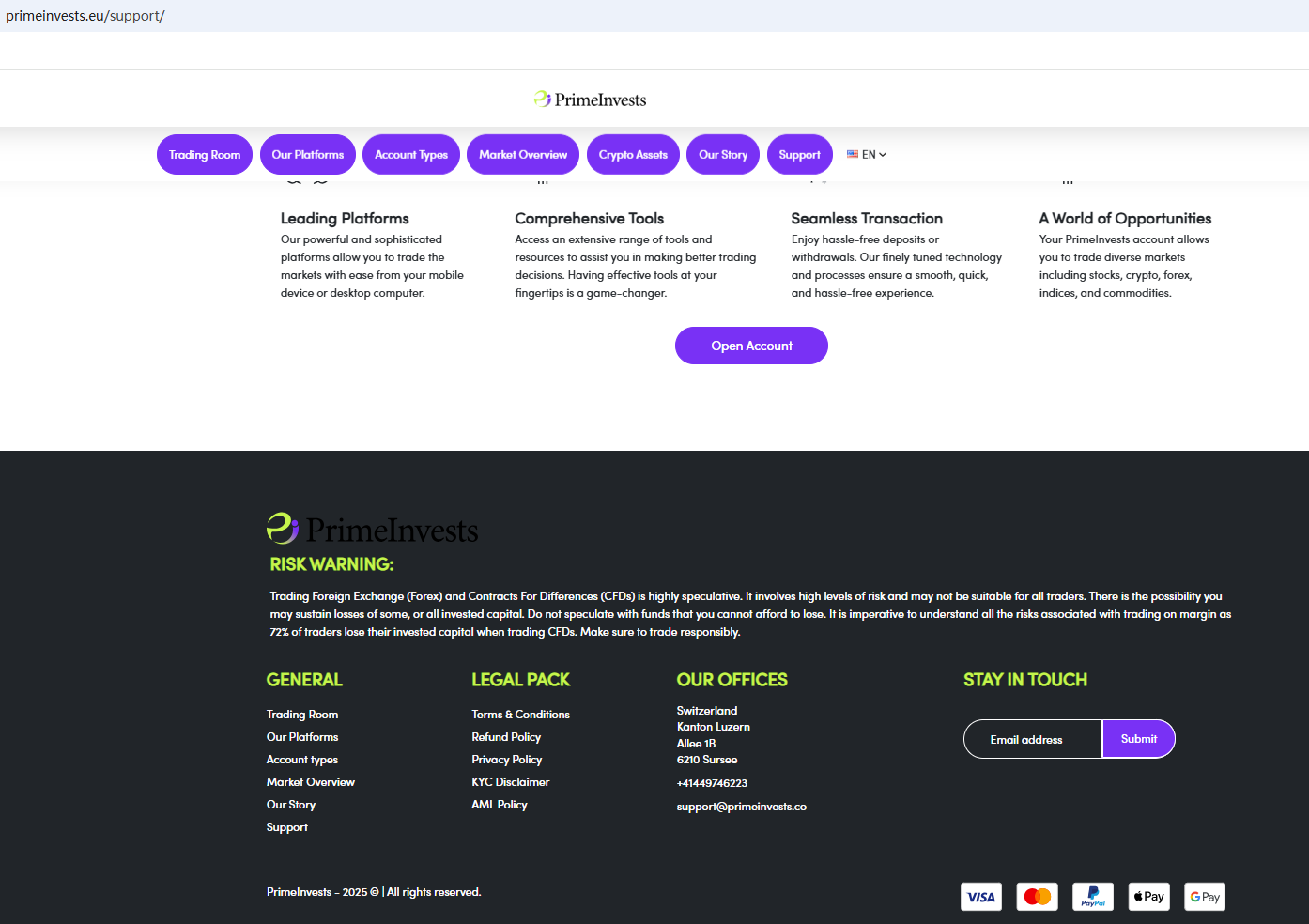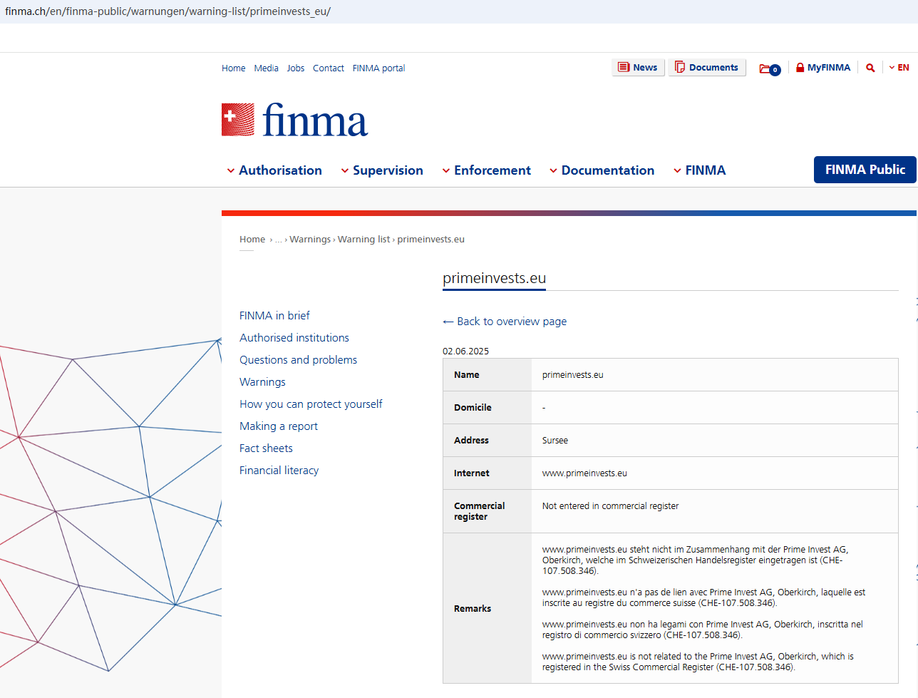 According to its website, it claims to be located in Switzerland. However, upon investigation, we found that the Swiss Financial Market Supervisory Authority (FINMA) issued a warning against PrimeInvests, stating that this broker is not entered in its commercial register.