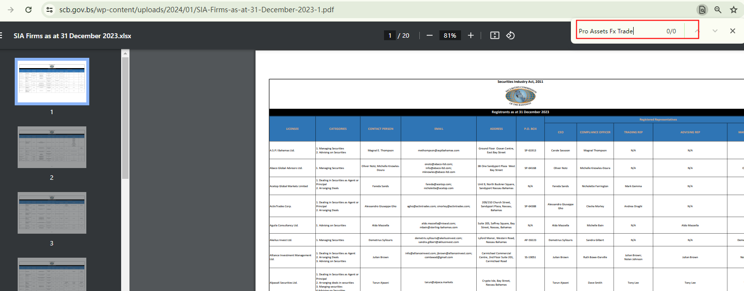 4) Pro Assets Fx Trade Ltd, claimed to be regulated by the Securities Commission of the Bahamas (SCB) with license number PIA-F429;