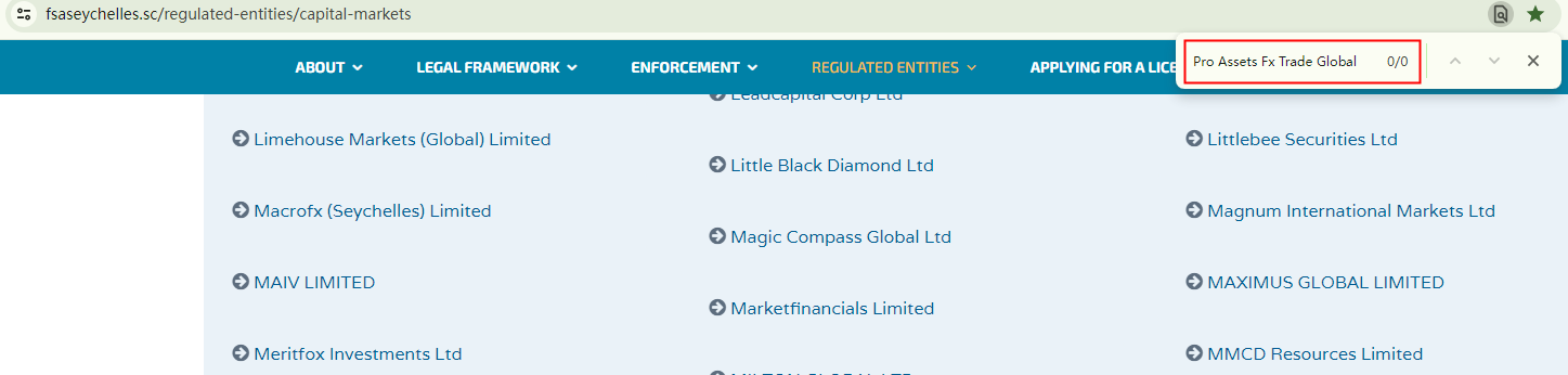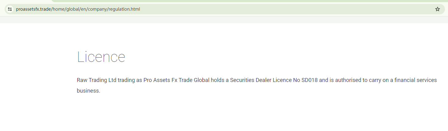 5) Raw Trading Ltd trading as Pro Assets Fx Trade Global, allegedly holds SDL number SD018, regulated by the Seychelles Financial Services Authority (FSA Seychelles).