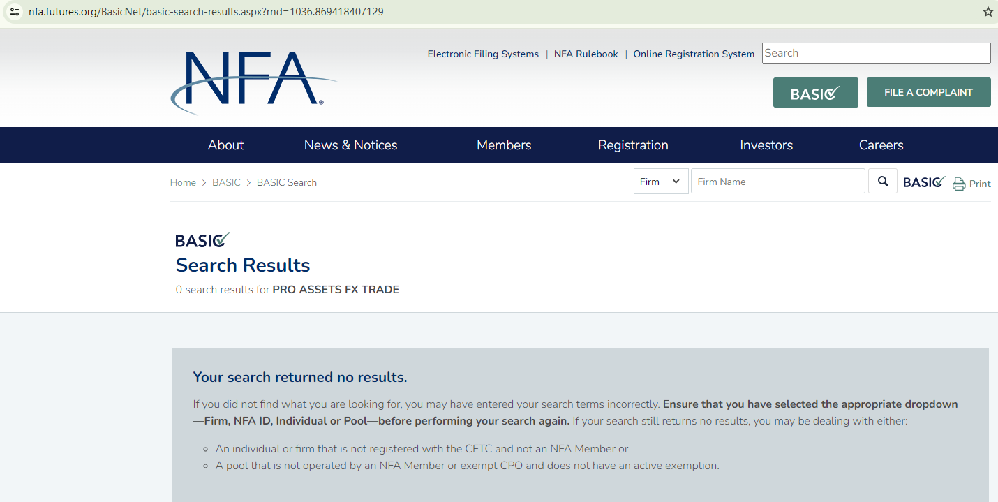 However, our comprehensive verification suggests that these licensing details are either falsified or misused. It is crucial to note that in the US, there is no institution called the Financial Services Authority. For Pro Assets Fx Trade to be a legitimate forex broker in the US, it is required to be registered as a member of the National Futures Association (NFA). However, it isn't an NFA member and thus not subject to the NFA's oversight.