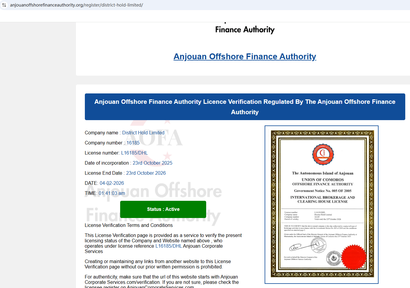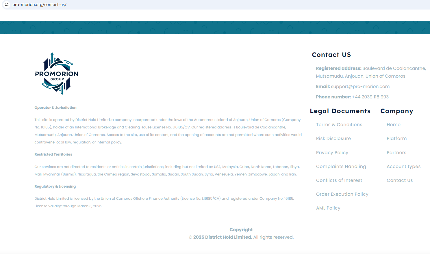 According to its website, Promorion Group claims that the website is operated by District Hold Limited and is registered with the Anjouan Offshore Finance Authority (AOFA). However, the AOFA is an offshore regulatory body that is known for its weak oversight and lack of international recognition. The jurisdiction offers limited investor protection, and its regulatory framework is generally considered to be unreliable by global financial standards.