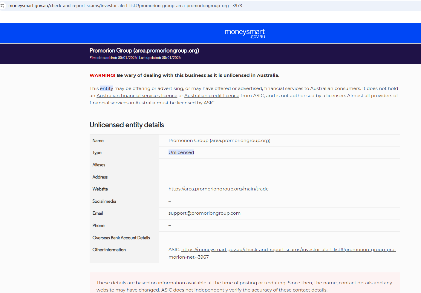 On Jan 30, 2026, the Australian Securities & Investments Commission (ASIC) issued a warning against Promorion Group, believing this company might be providing financial services or products without proper authorization. https://moneysmart.gov.au/check-and-report-scams/investor-alert-list#!promorion-group-area-promoriongroup-org--3973