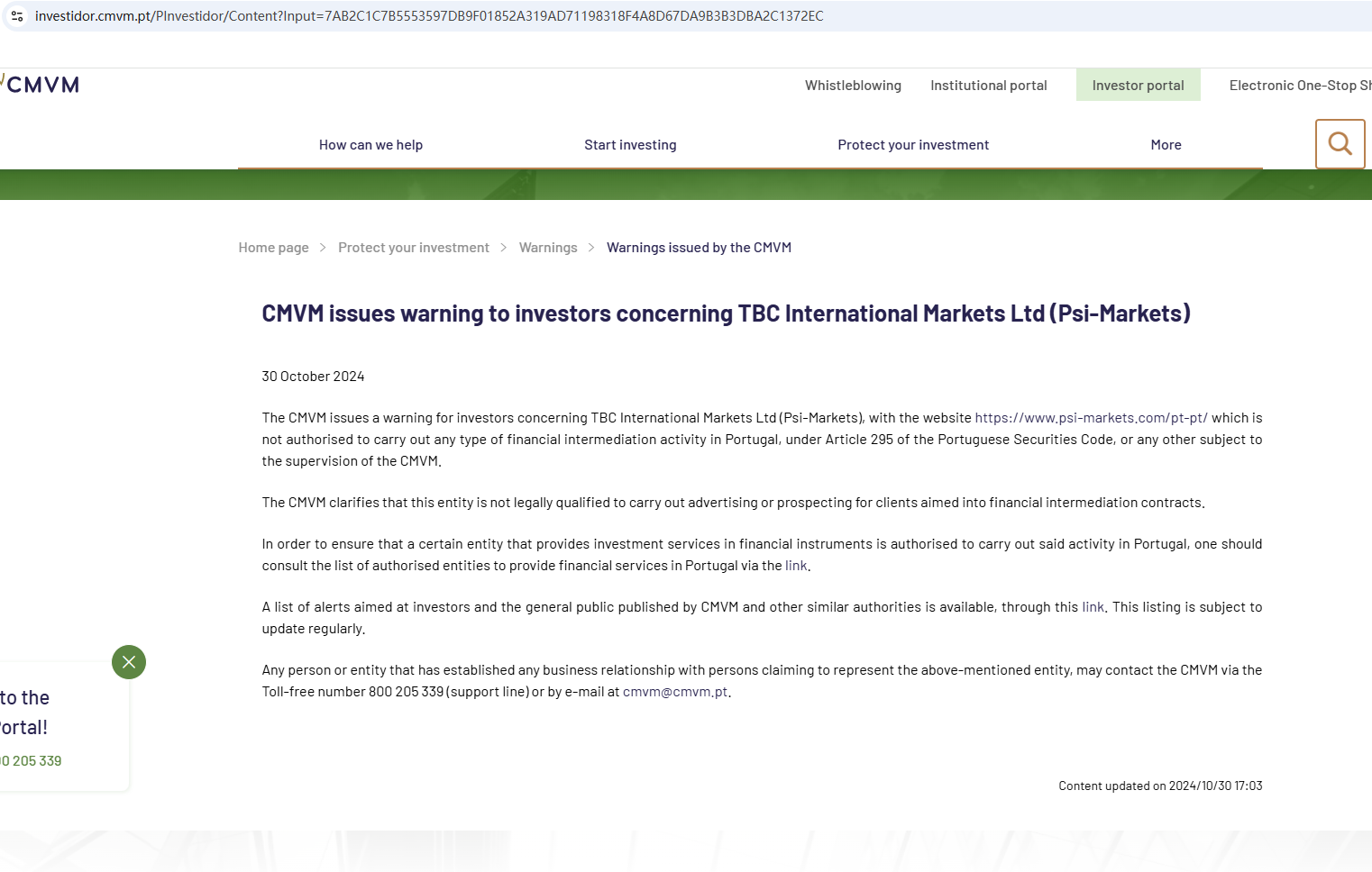 PSI Markets claims to be operated by TBC International Markets LTD, which is supposedly authorized and regulated by the International Financial Services Commission of Dominica with license number 2019. However, it is critical to note that the Financial Services Unit (FSU) of the Ministry of Finance is the sole Financial Services Regulatory Authority in Dominica. As per the existing framework, forex brokers operating in Dominica are not governed by any governmental regulatory entity. This facts makes PSI Markets' regulatory claims in doubt.Additionally, the Financial Conduct Authority (FCA) has issued a warning against PSI Markets for providing financial services or products without proper authorization in the UK.In essence, PSI Markets is not regulated by any governing body. Entrusting it with investors' funds is highly risky, as there are no legal protections in place to safeguard the funds.PSI Markets appears to be a scam.