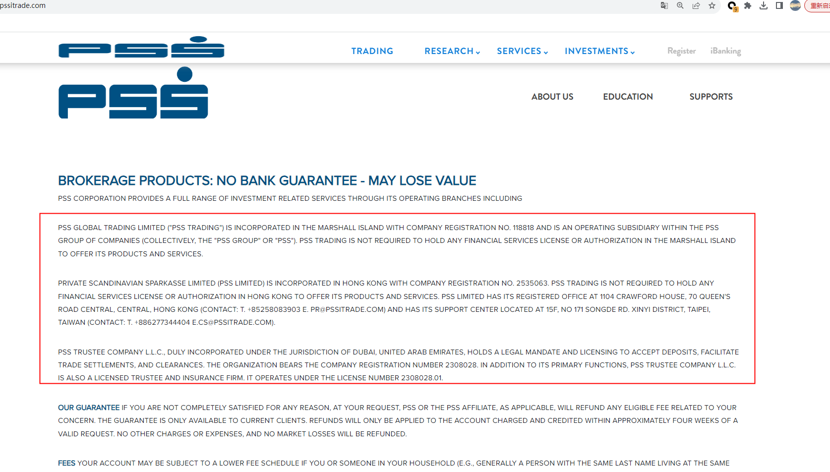 According to its website, PSS CORPORATION provides a full range of investment related services through its operation branches. PSS GLOBAL TRADING LIMITED ("PSS TRADING") is incorporated in the Marshall Islands with registration NO.118818, PRIVATE SCANDINAVIAN SPARKASSE LIMITED (PSS LIMITED) is incorporated in the Hong Kong with registration NO. 2535063, PSS TRUSTEE COMPANY L.L.C.is incorporated in DUBAI. Upon investigation, we didn't find any matching information in the Securities and Futures Commission (SFC), DuBai Financial Services Authority (DFSA), Securities and Commodities Authority (SCA), Central Bank of U.A.E.(CBUAE). We found the relevant registration information in the Marshall Islands Registry (IRI) , but registration in the Marshall Islands does not mean it is legal, because IRI is only a privately held registrar and does not regulate foreign exchange.