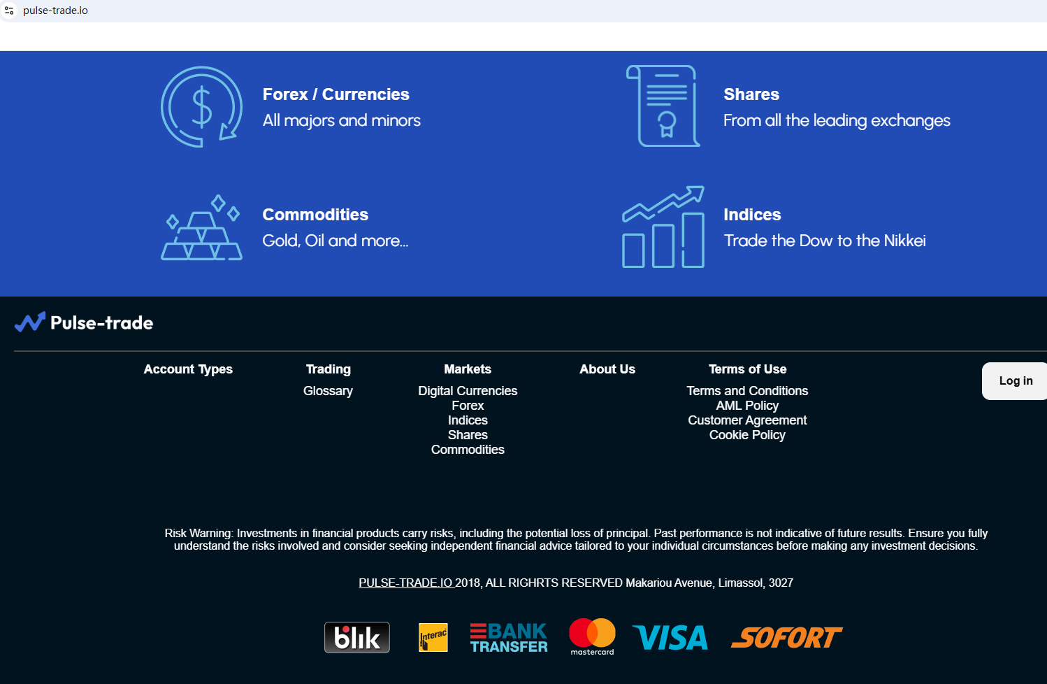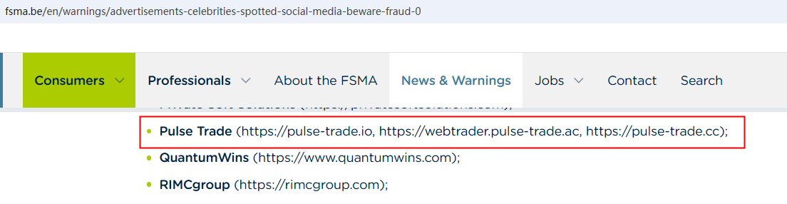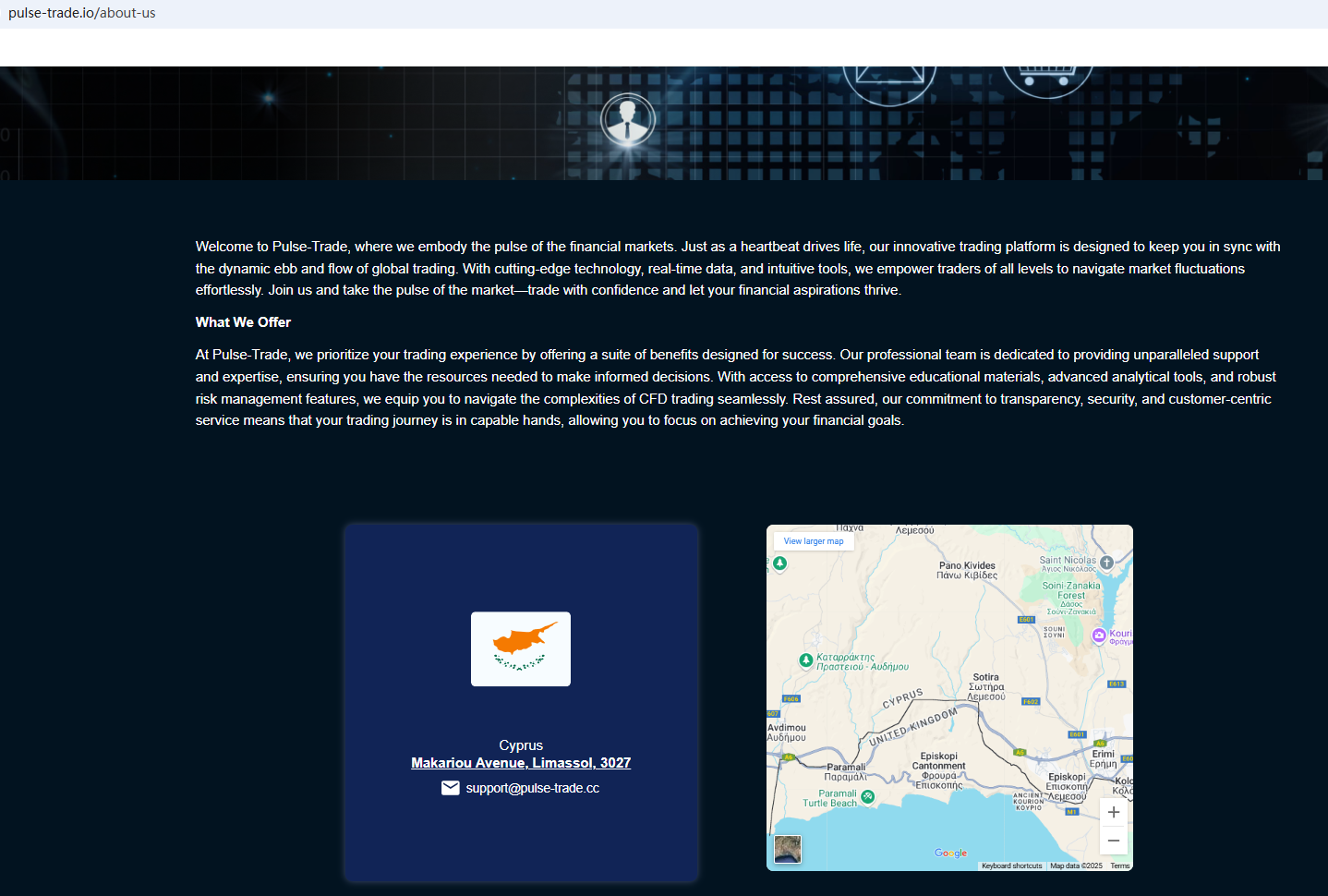 According to its website, it is located in Cyprus. Upon investigation, no matching information was found in the Cyprus Securities and Exchange Commission (CySEC). What's more, the Financial Services and Markets Authority (FSMA) issued a warning about Pulse Trade for the lack of the required authorization.