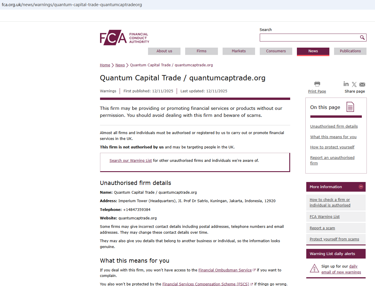 On Nov 12, 2025, the Financial Conduct Authority (FCA) issued a warning regarding Quantum Capital Trade, suspecting that this company may be offering financial services or products without the necessary authorization. https://www.fca.org.uk/news/warnings/quantum-capital-trade-quantumcaptradeorg