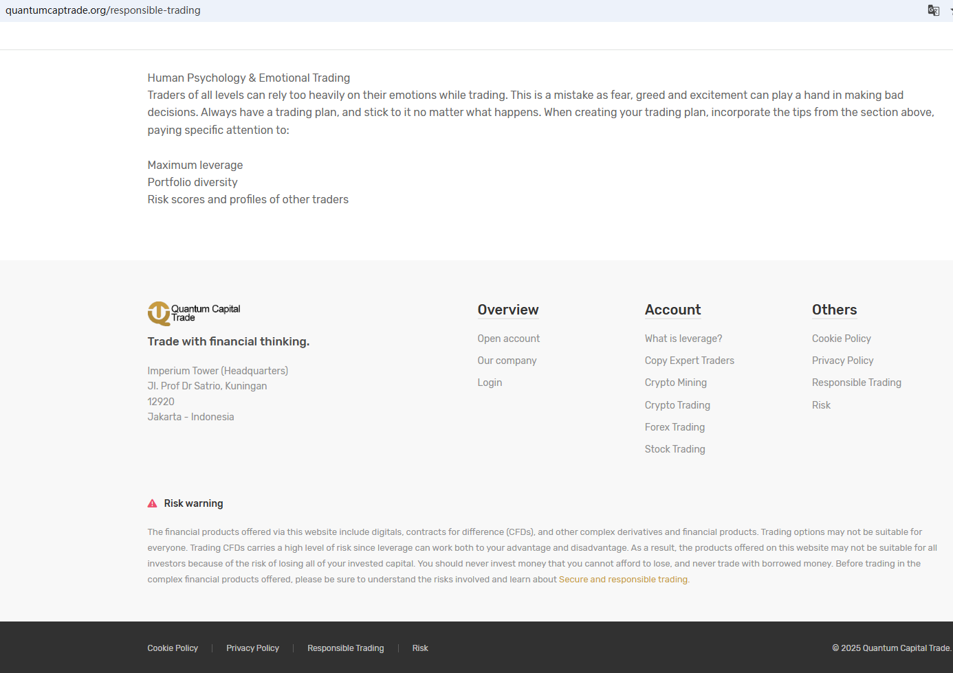 According to its website, the company claims to have been established in Indonesia in 2014. However, our investigation revealed that its domain was only created in 2025, clearly indicating that the information displayed on its website is inconsistent with the facts. Furthermore, we found no matching information in the Badan Pengawas Perdagangan Berjangka Komoditi (BAPPEBTI). In addition, the Financial Conduct Authority (FCA) issued a warning regarding Quantum Capital Trade, suspecting that this company may be offering financial services or products without the necessary authorization.