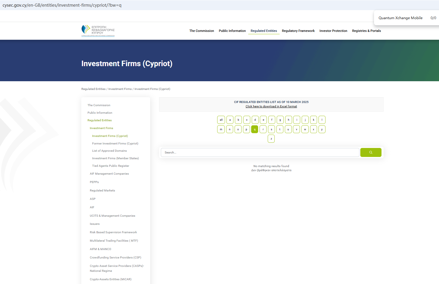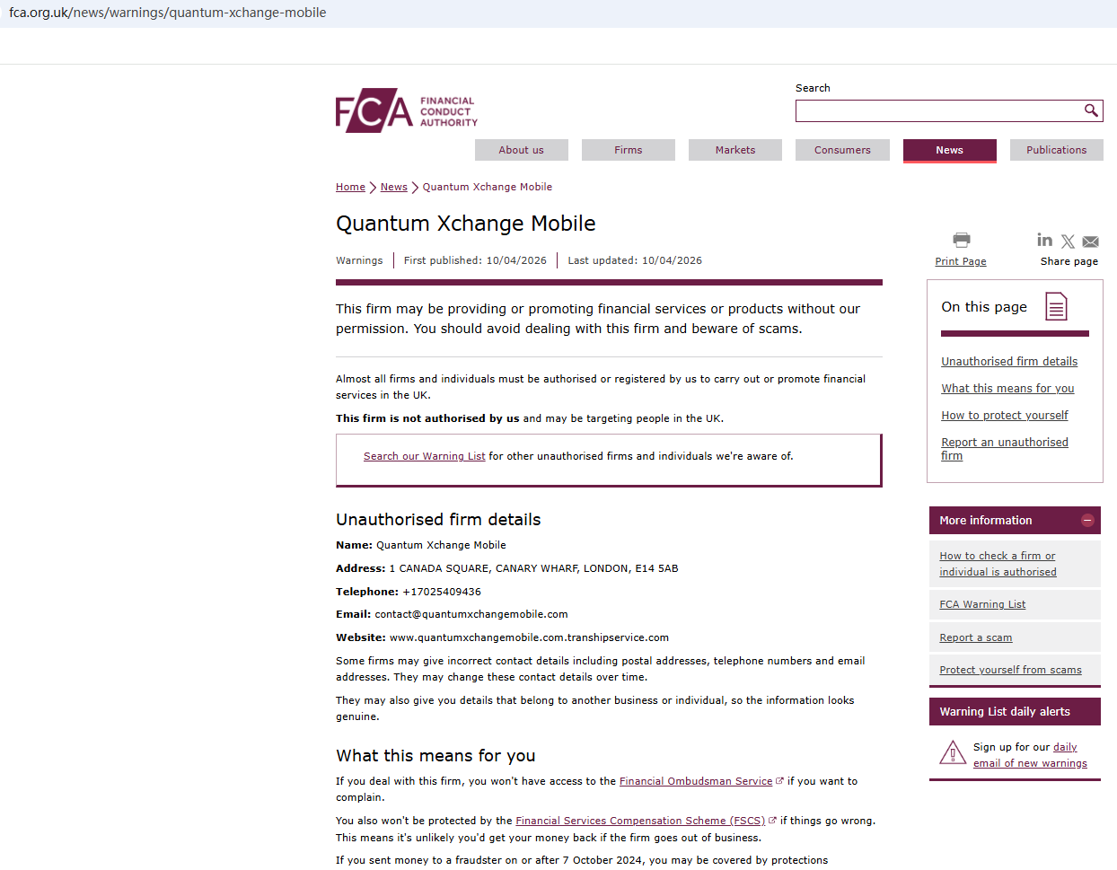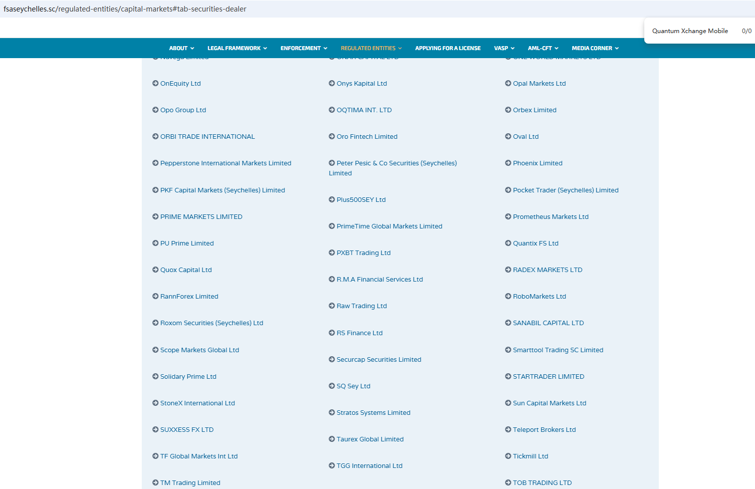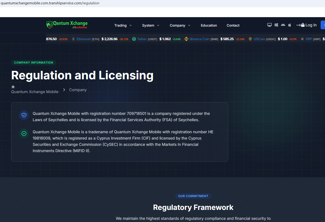 According to its website, it claims to be regulated by the Seychelles Financial Services Authority (Seychelles FSA) and the Cyprus Securities and Exchange Commission (CySEC). Upon investigation, no matching information was found in the Seychelles FSA and CySEC. In addition, the Financial Conduct Authority (FCA) issued a warning regarding Quantum Xchange Mobile, suspecting that this company may be offering financial services or products without the necessary authorization.