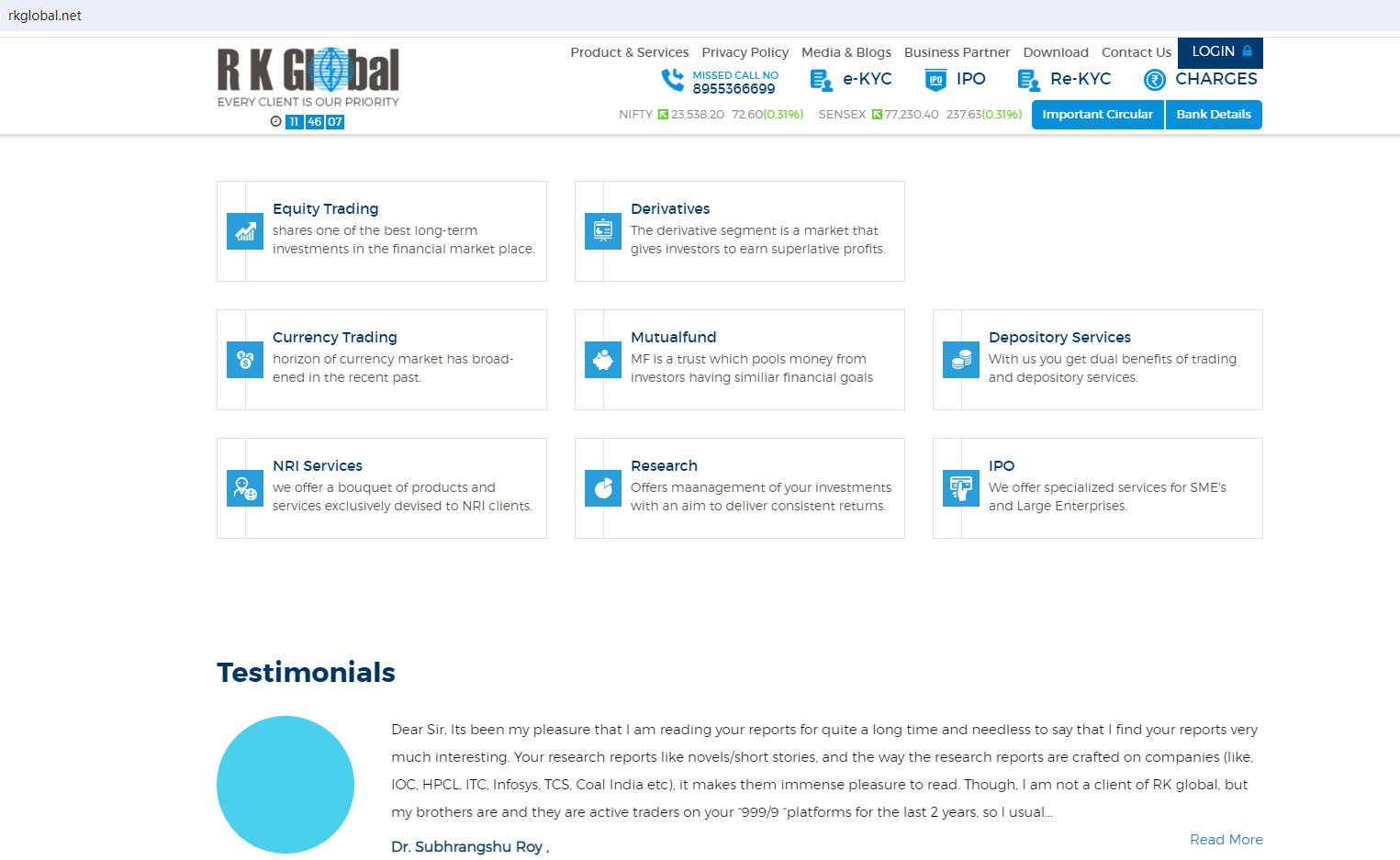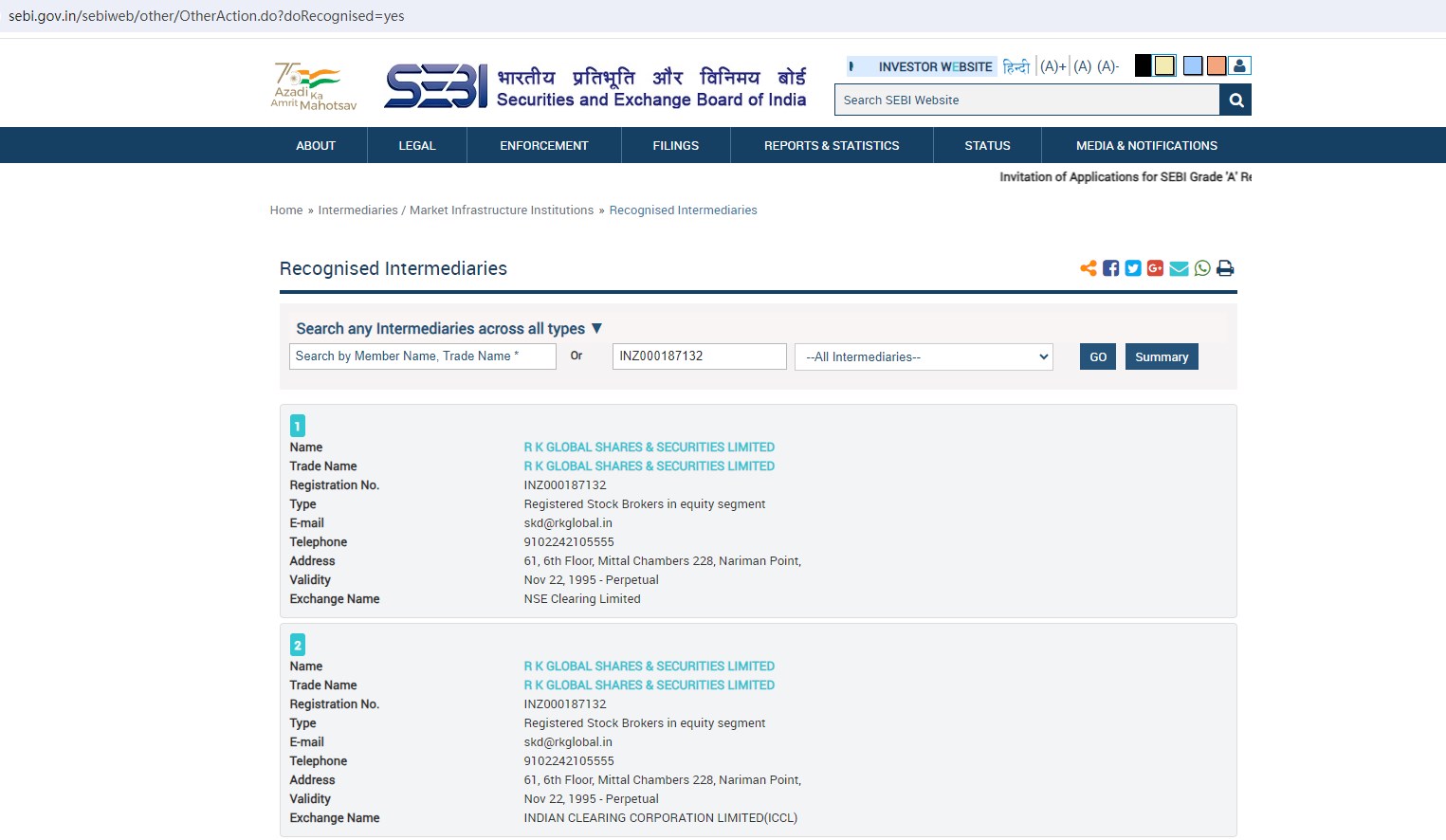 Upon investigation, we found the registration of R K GLOBAL SHARES & SECURITIES LIMITED as Stock Brokers in the SEBI. However, it's important to note that there are no specific regulations for the forex market in India, and SEBI licenses Stock brokers in the Currency Derivative segment, not Forex brokers or Forex trading activities.