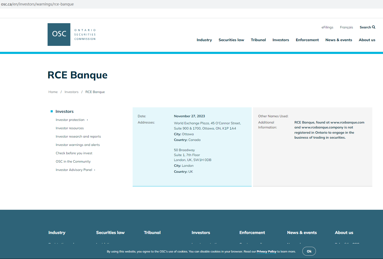 Moreover, Cyprus Securities and Exchange Commission (CySEC) issued a warning that RCE Banque did not belong to an entity that has been granted authorization for the provision of investment services.