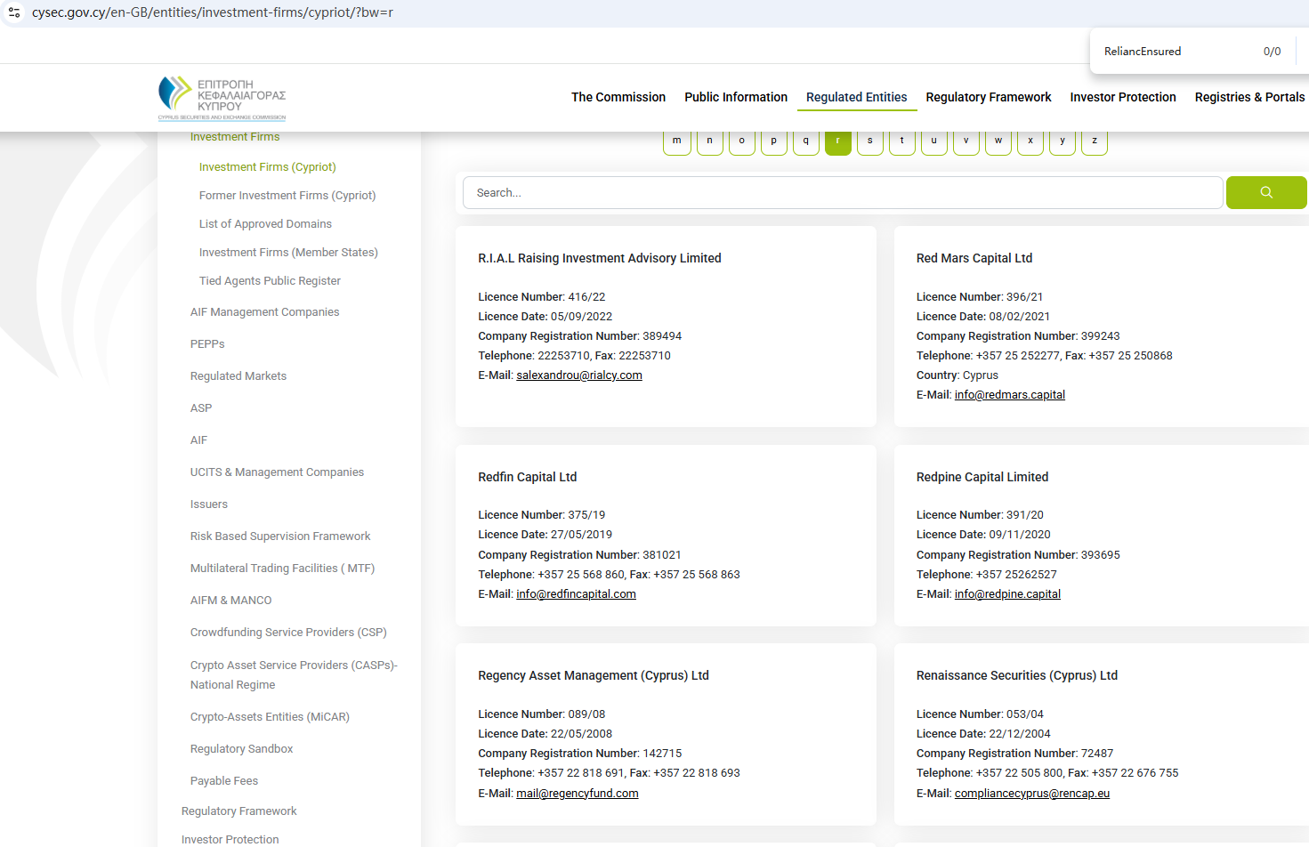 According to its website, it is regulated by both the Financial Conduct Authority (FCA) and the Cyprus Securities and Exchange Commission (CySEC). However, a search revealed no matching information with CySEC. Furthermore, the FCA issued a warning regarding ReliancEnsured, suspecting that this company may be offering financial services or products without the necessary authorization.
