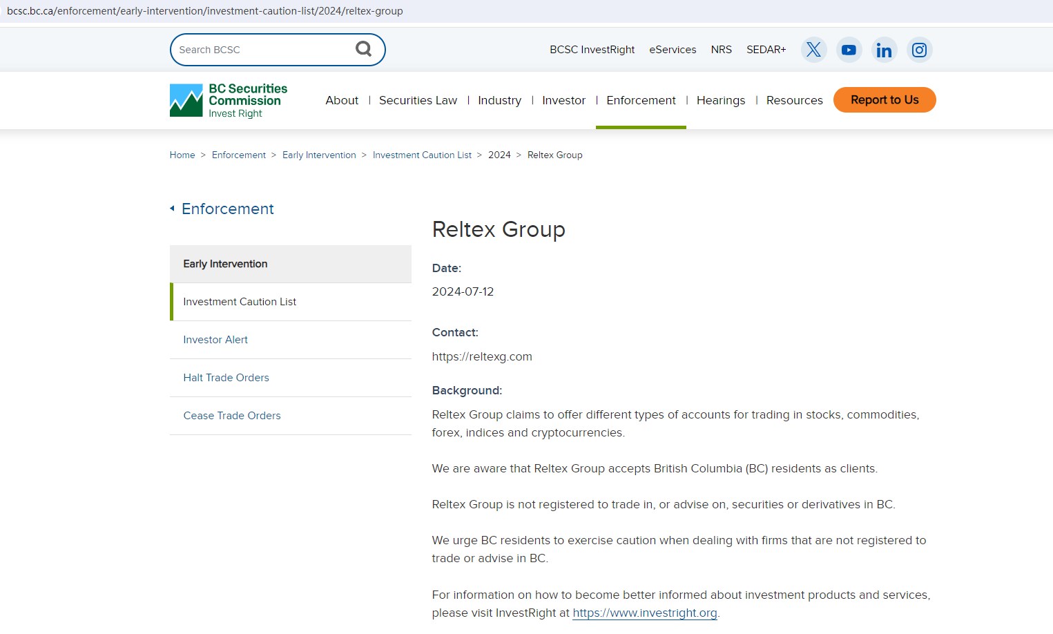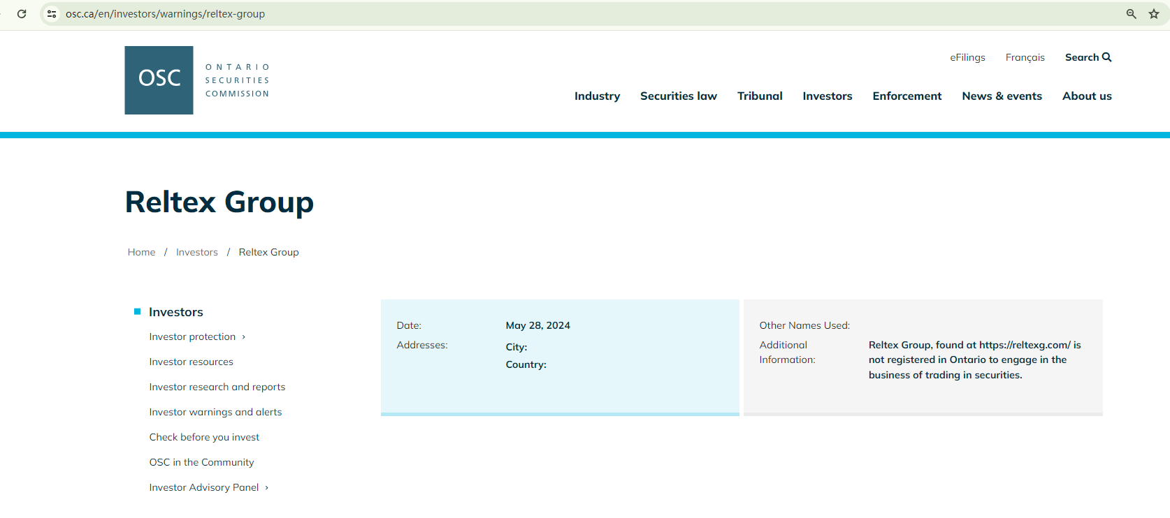 Adding to the concerns, the Ontario Securities Commission (OSC) has issued a warning against Reltex Group, stating that this broker is not registered in Ontario to engage in the business of trading in securities.