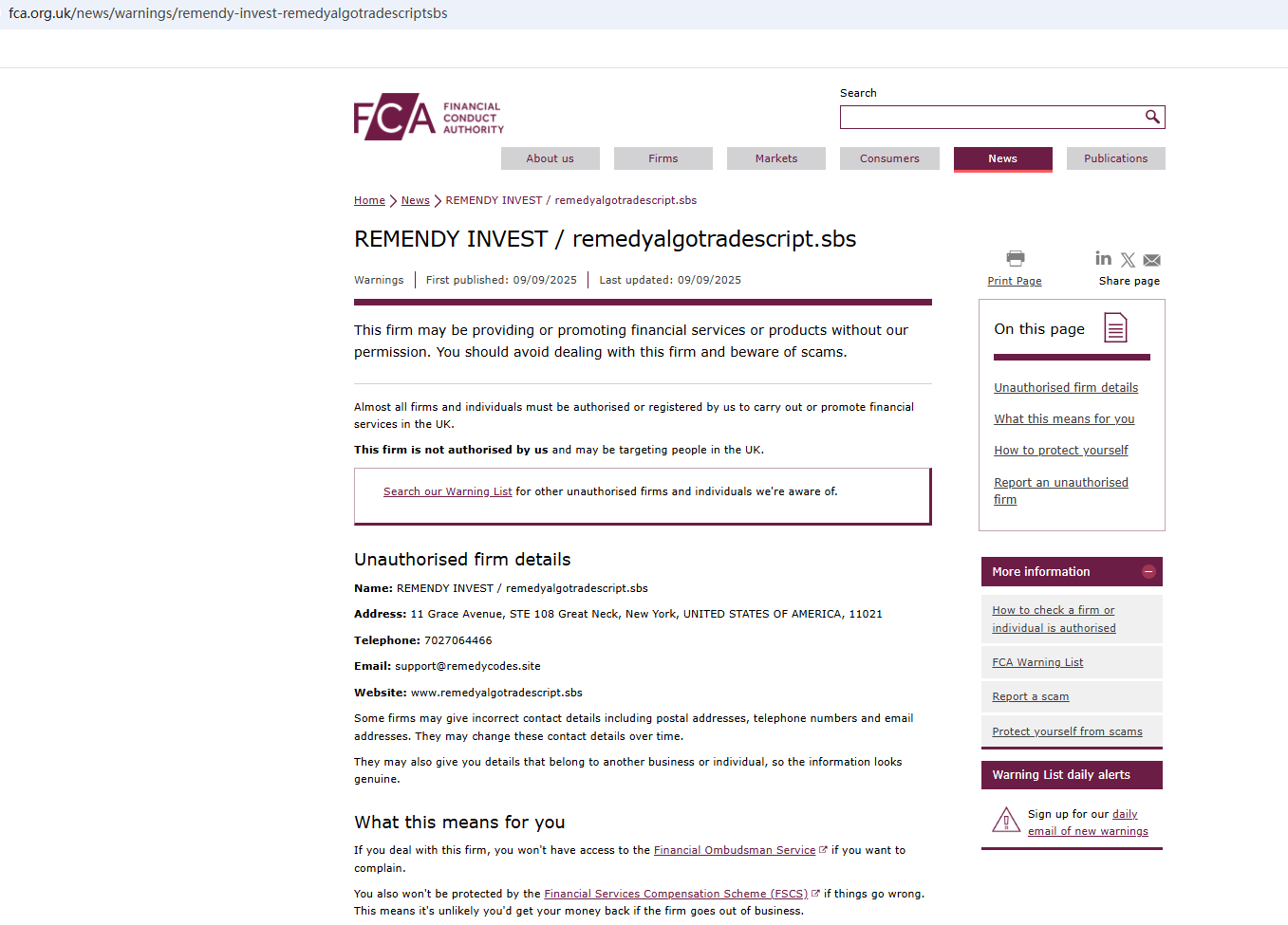 On Sept 9, 2025, the Financial Conduct Authority (FCA) issued a warning against Remendy Invest, believing this company might be providing financial services or products without proper authorization. https://www.fca.org.uk/news/warnings/remendy-invest-remedyalgotradescriptsbs