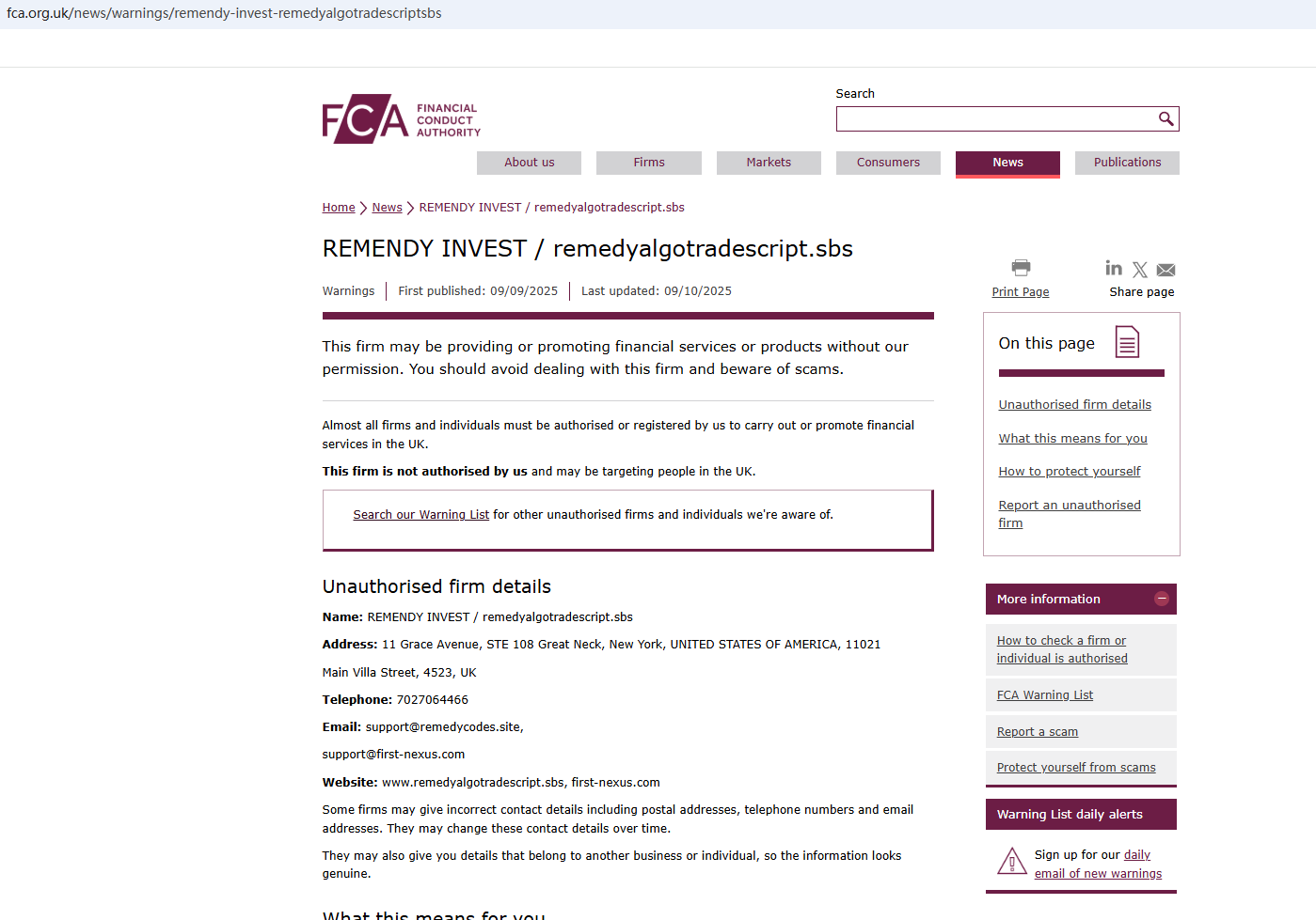 The FCA has once again issued a warning against Remendy Invest. Remendy Invest has registered a new domain name (http://first-nexus.com/) in an attempt to commit fraud. Investors are advised to be aware and stay away from this scam.